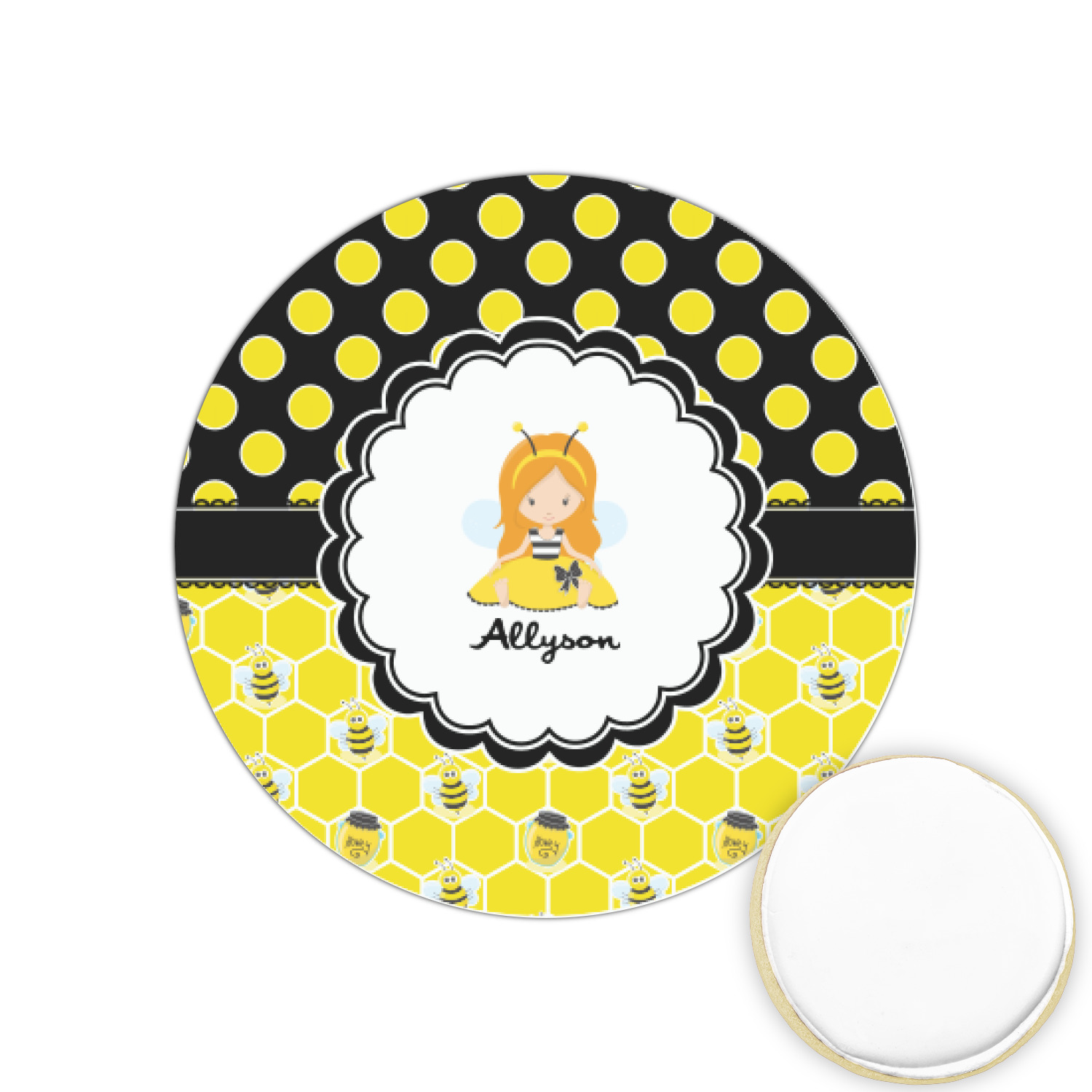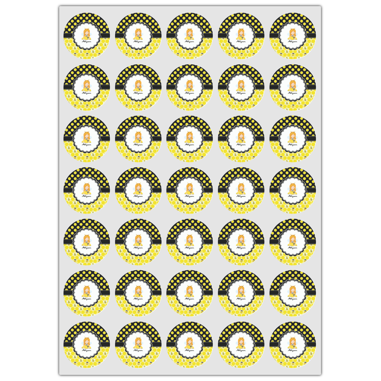 A wide lace black ribbon separates the pattern and connects a beautiful black trimmed white decorative label that provides a focal point for either a little bumble-bee or a bumble-bee obsessed girl and his/her name. As a special touch, personalize your little bumble-bee girl's hair and skin color.