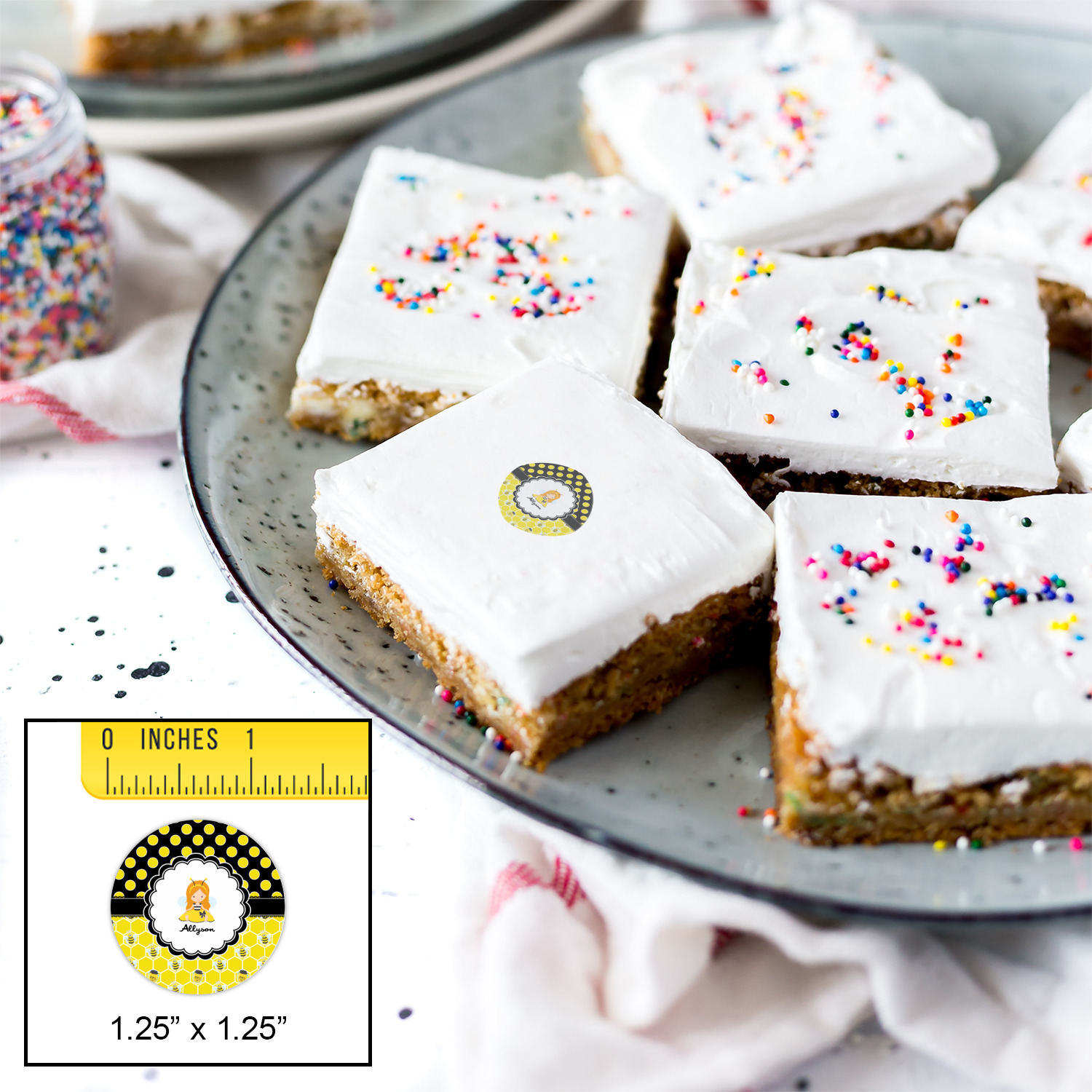 Our little bees have been hard at work and Winnie the Pooh would be jealous of this stash of honey. We used a playful polka dot pattern of black and yellow. On the bottom our bees have been hard at work making honey out of the honeycombs.