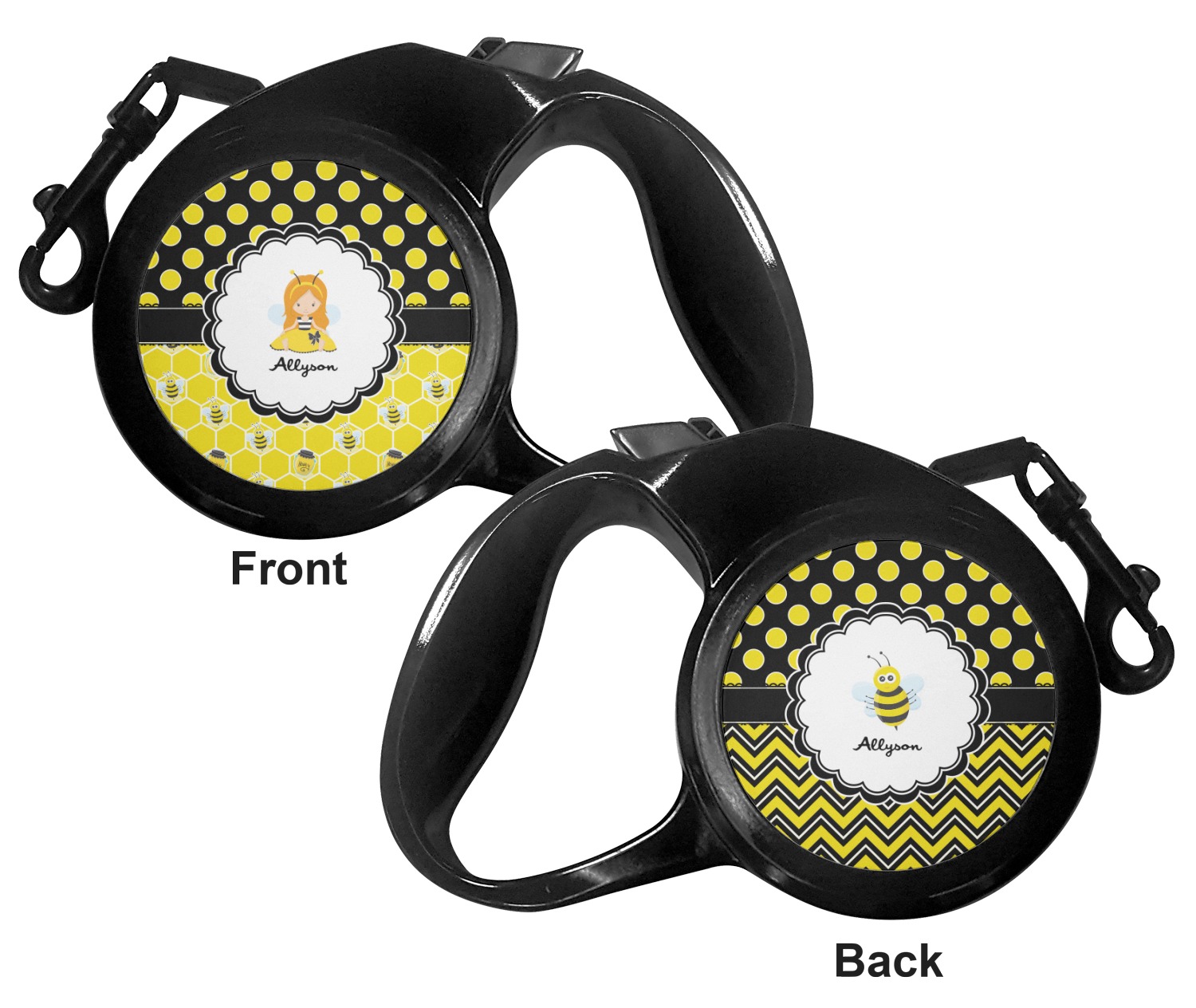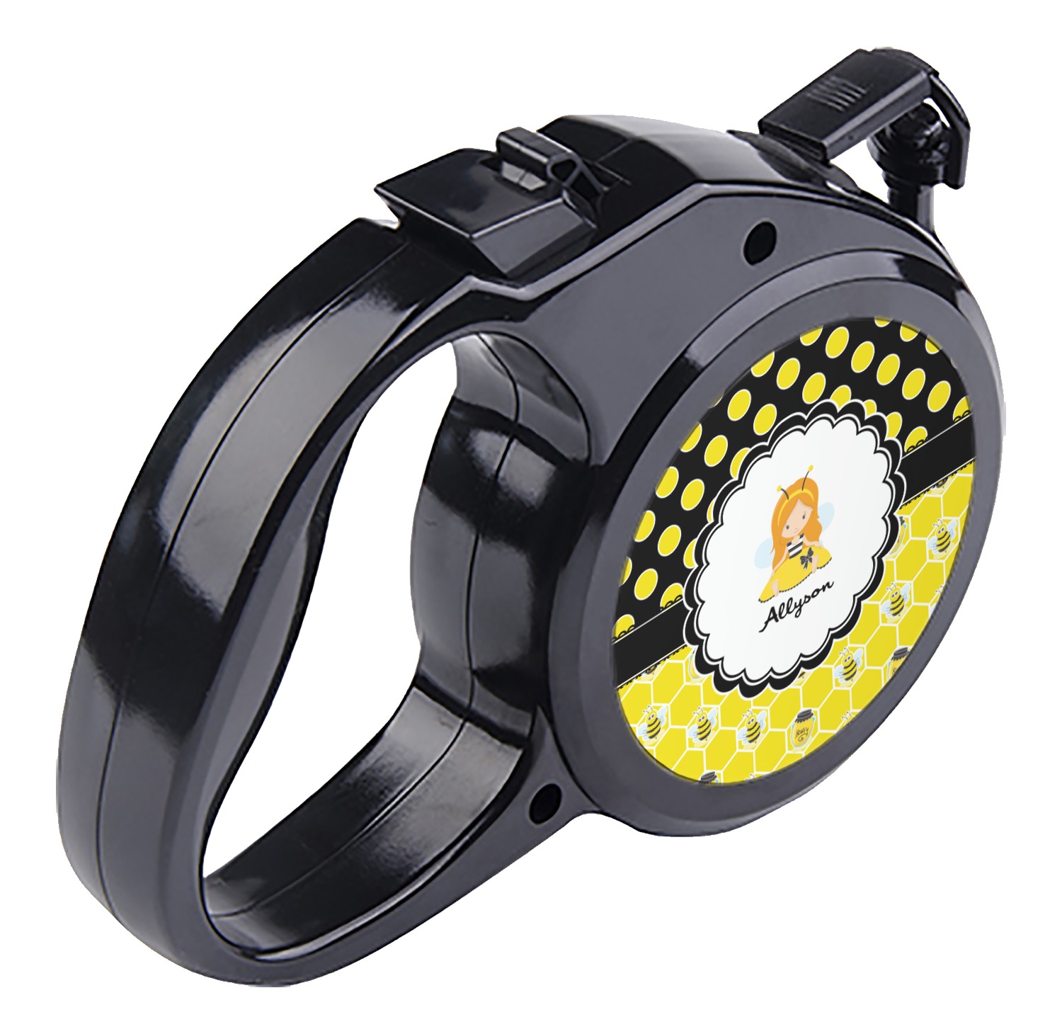 The leash's plastic handle is accommodating of your grip and displays your customization on both sides. The dog leash also features the traditional bolt snap clip, for easy fastening to your dog's collar. The leash and leash handle themselves are both black in color.