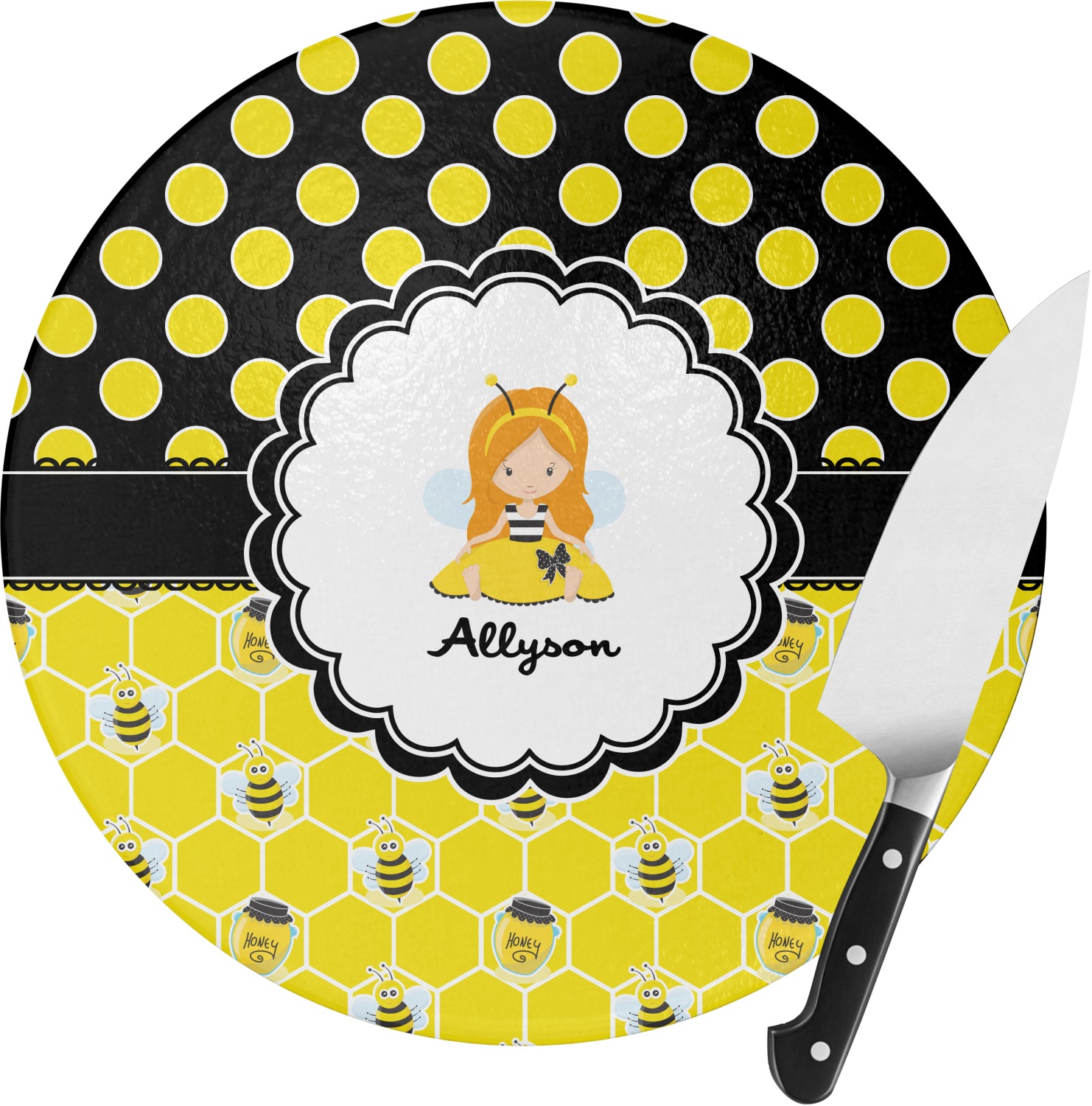 Our little bees have been hard at work and Winnie the Pooh would be jealous of this stash of honey. We used a playful polka dot pattern of black and yellow. On the bottom our bees have been hard at work making honey out of the honeycombs.