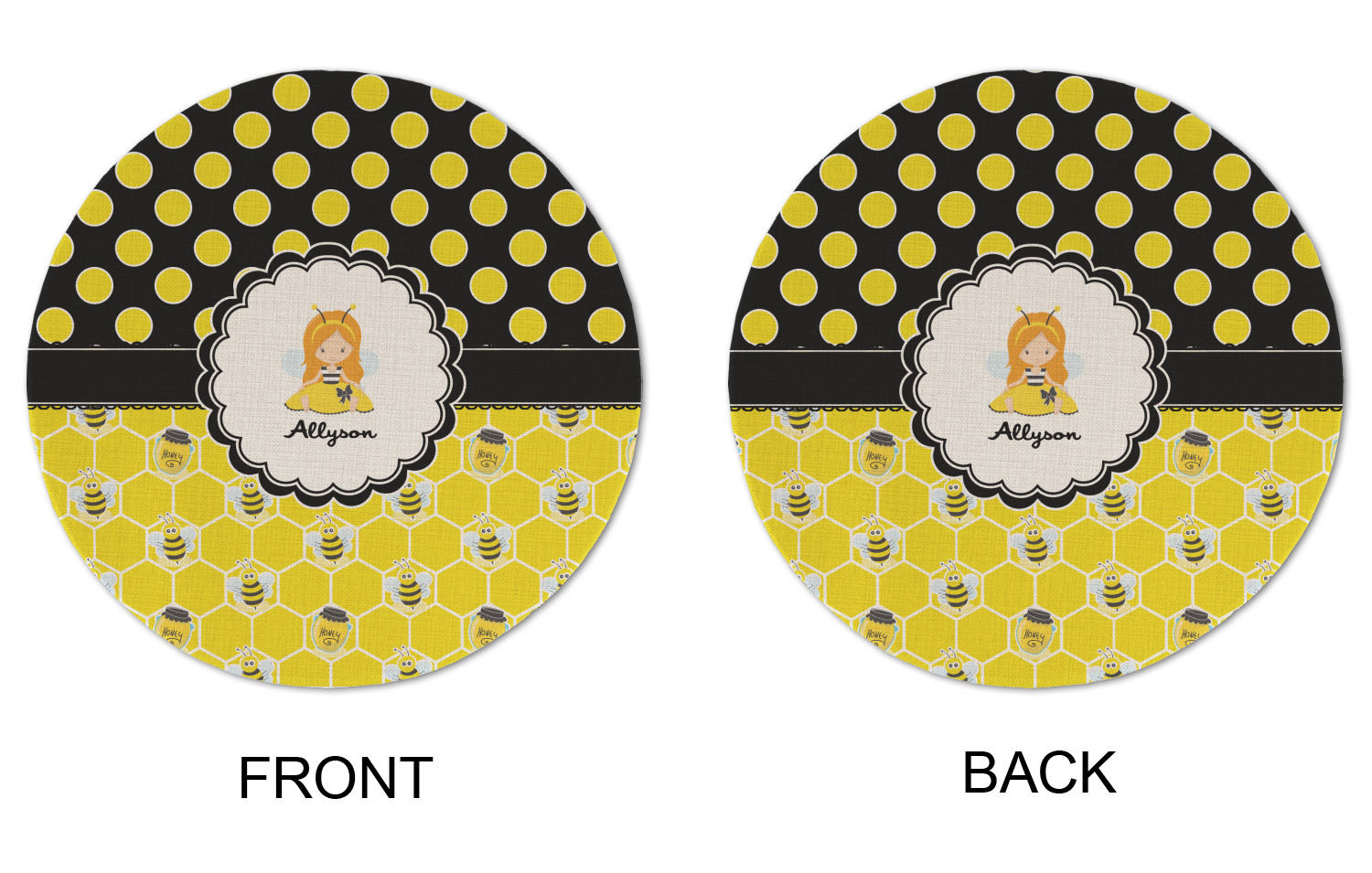 A wide lace black ribbon separates the pattern and connects a beautiful black trimmed white decorative label that provides a focal point for either a little bumble-bee or a bumble-bee obsessed girl and his/her name. As a special touch, personalize your little bumble-bee girl's hair and skin color.