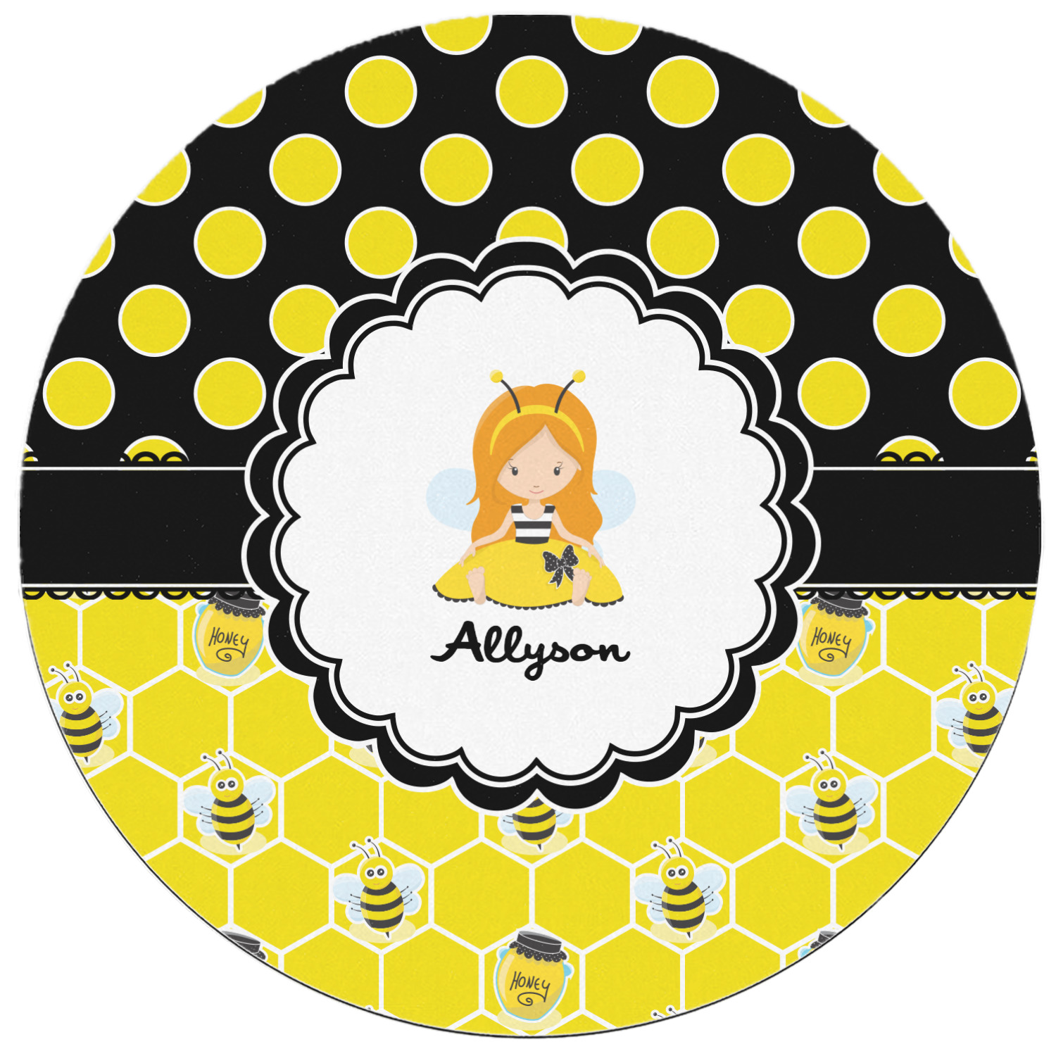 A wide lace black ribbon separates the pattern and connects a beautiful black trimmed white decorative label that provides a focal point for either a little bumble-bee or a bumble-bee obsessed girl and his/her name. As a special touch, personalize your little bumble-bee girl's hair and skin color.