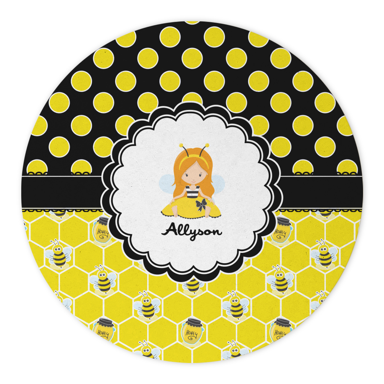 A wide lace black ribbon separates the pattern and connects a beautiful black trimmed white decorative label that provides a focal point for either a little bumble-bee or a bumble-bee obsessed girl and his/her name. As a special touch, personalize your little bumble-bee girl's hair and skin color.