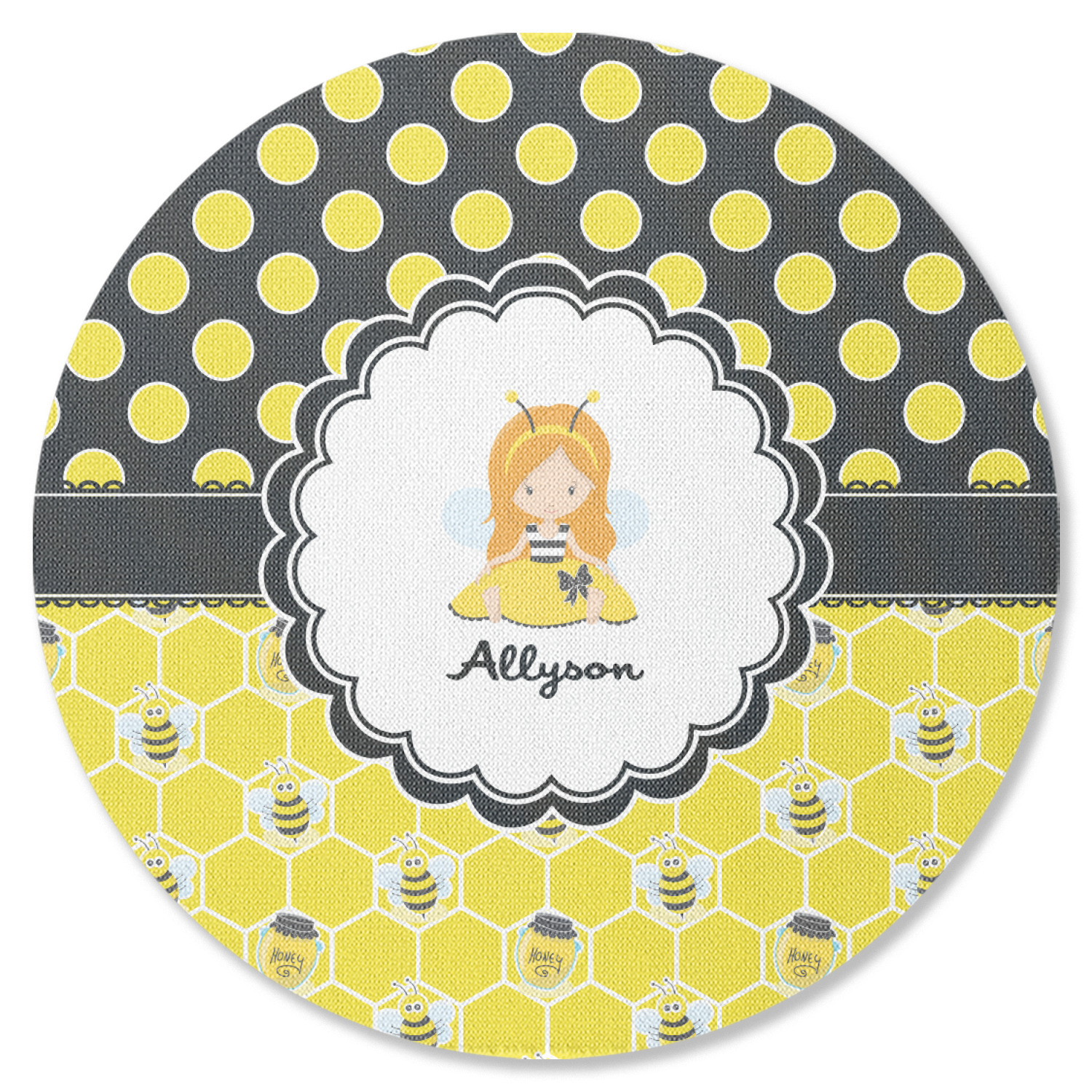 A wide lace black ribbon separates the pattern and connects a beautiful black trimmed white decorative label that provides a focal point for either a little bumble-bee or a bumble-bee obsessed girl and his/her name. As a special touch, personalize your little bumble-bee girl's hair and skin color.