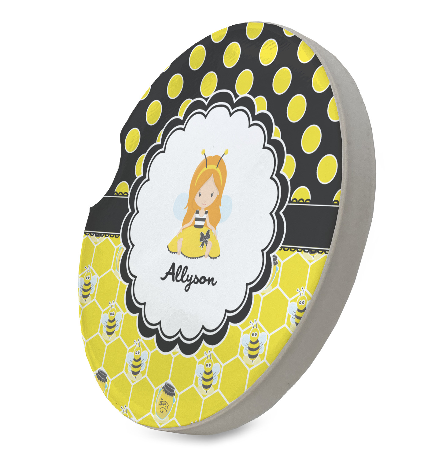 A wide lace black ribbon separates the pattern and connects a beautiful black trimmed white decorative label that provides a focal point for either a little bumble-bee or a bumble-bee obsessed girl and his/her name. As a special touch, personalize your little bumble-bee girl's hair and skin color.