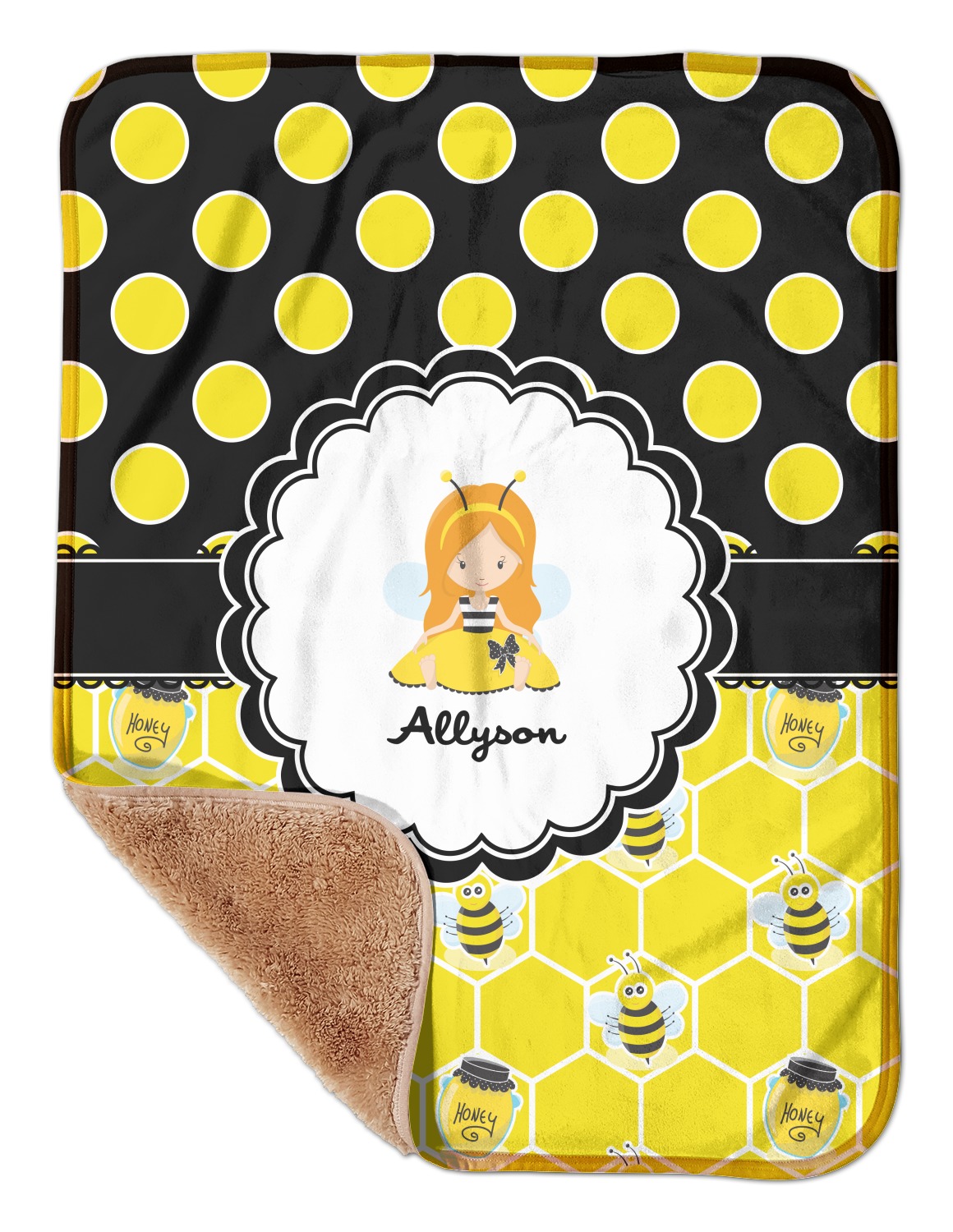 These toddler blankets are made of two different materials; the front side is made of a velvety, minky-like material that displays your customization and is perfect for a baby's delicate skin. The underside is crafted from a fluffy, sherpa fleece, and bears a classy, tan color. The dual texture gives your baby added comfort, as both sides are incredibly soft and plush. The corners of this blanket are rounded, and the ribbing of the blanket is a tan color, which complements the sandy color of the sherpa fleece. At approximately 30 by 40 inches, this custom baby blanket is the perfect size for babies and toddlers.