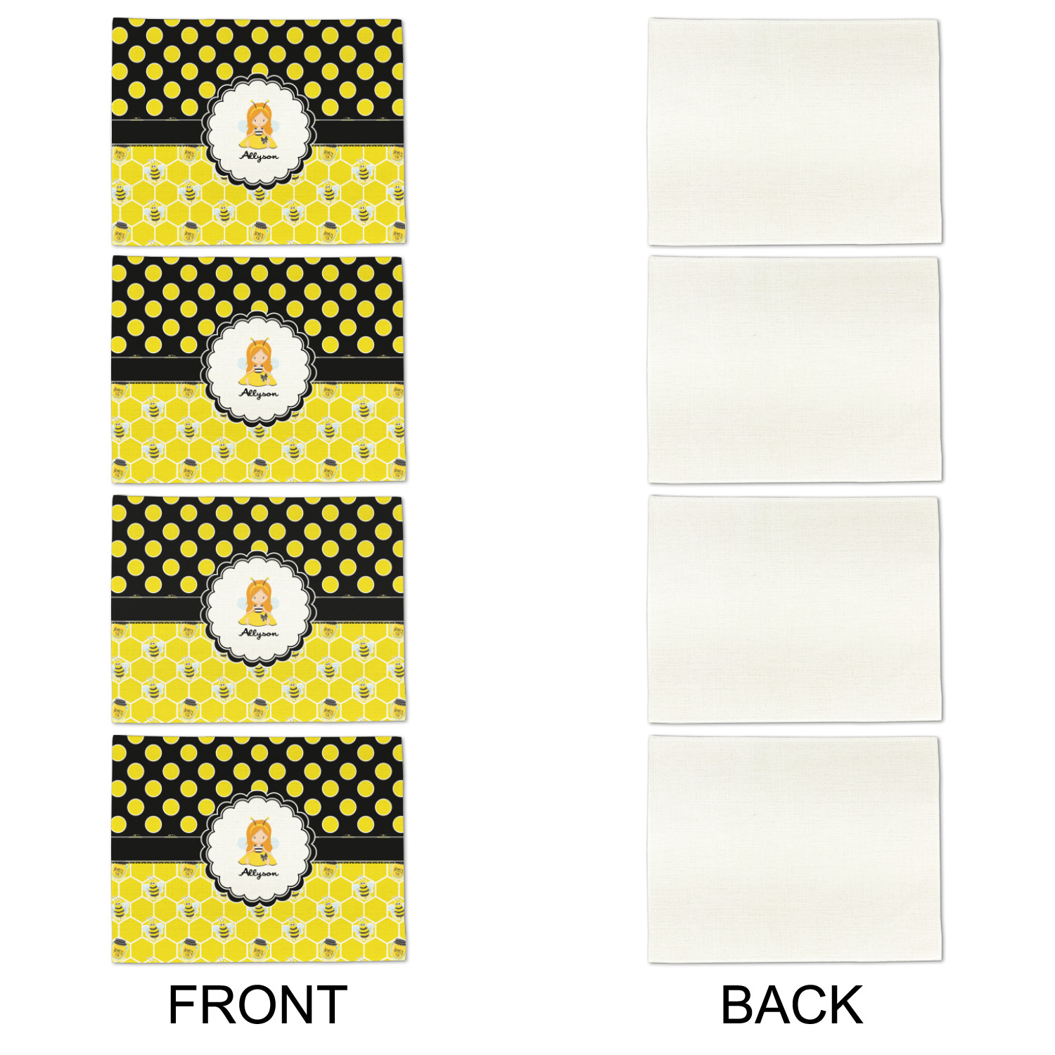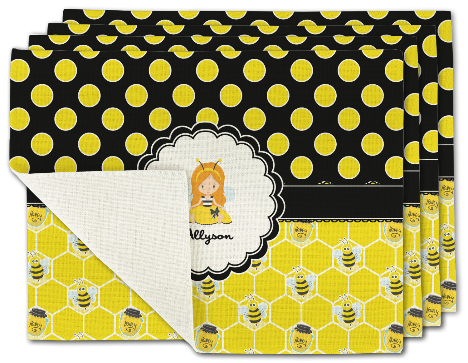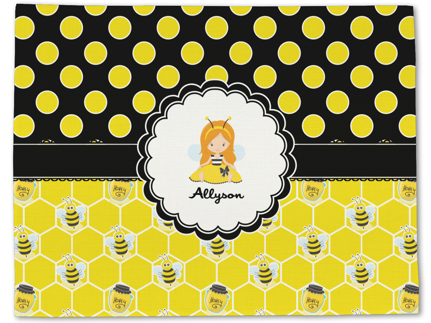 A wide lace black ribbon separates the pattern and connects a beautiful black trimmed white decorative label that provides a focal point for either a little bumble-bee or a bumble-bee obsessed girl and his/her name. As a special touch, personalize your little bumble-bee girl's hair and skin color.