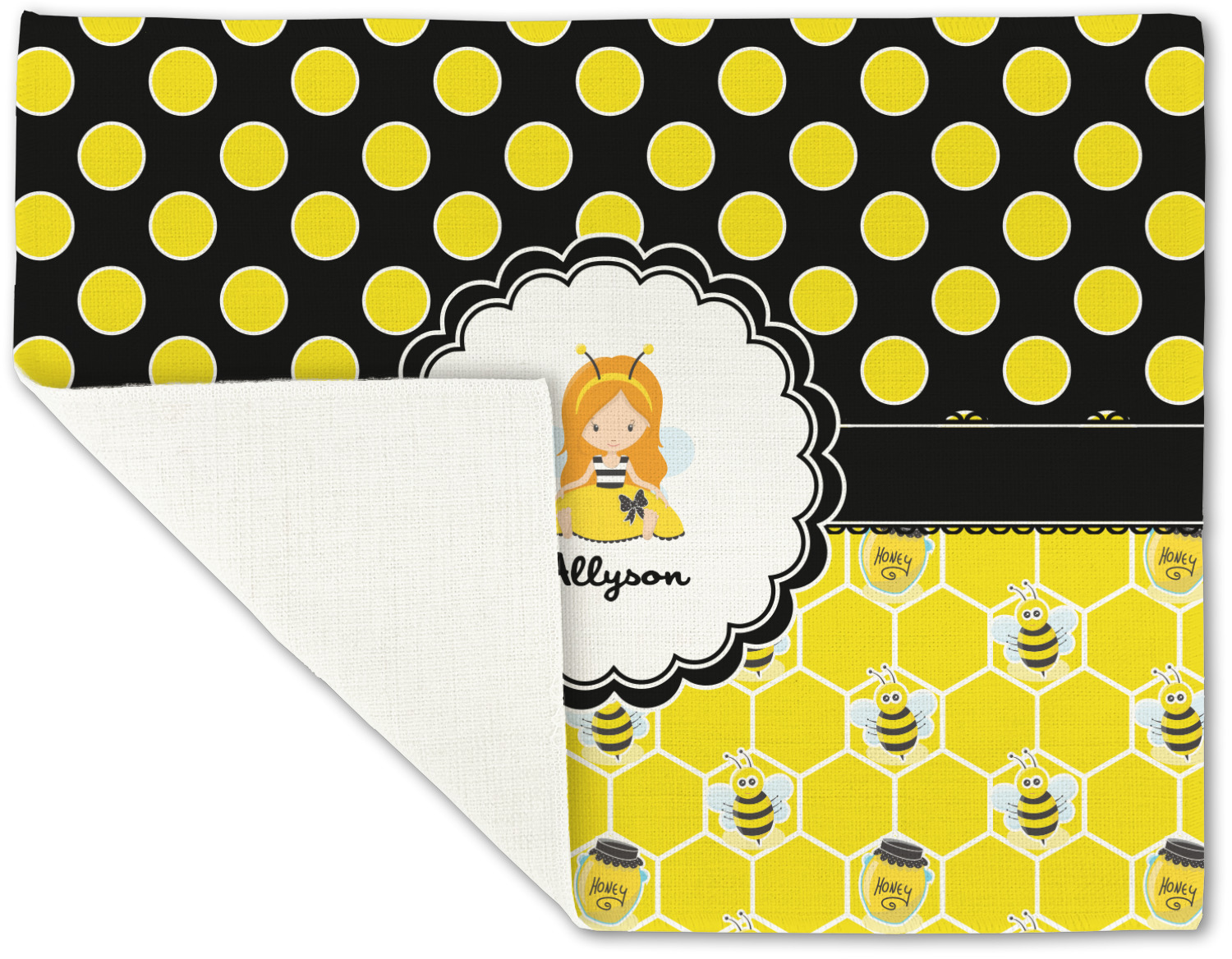 A wide lace black ribbon separates the pattern and connects a beautiful black trimmed white decorative label that provides a focal point for either a little bumble-bee or a bumble-bee obsessed girl and his/her name. As a special touch, personalize your little bumble-bee girl's hair and skin color.