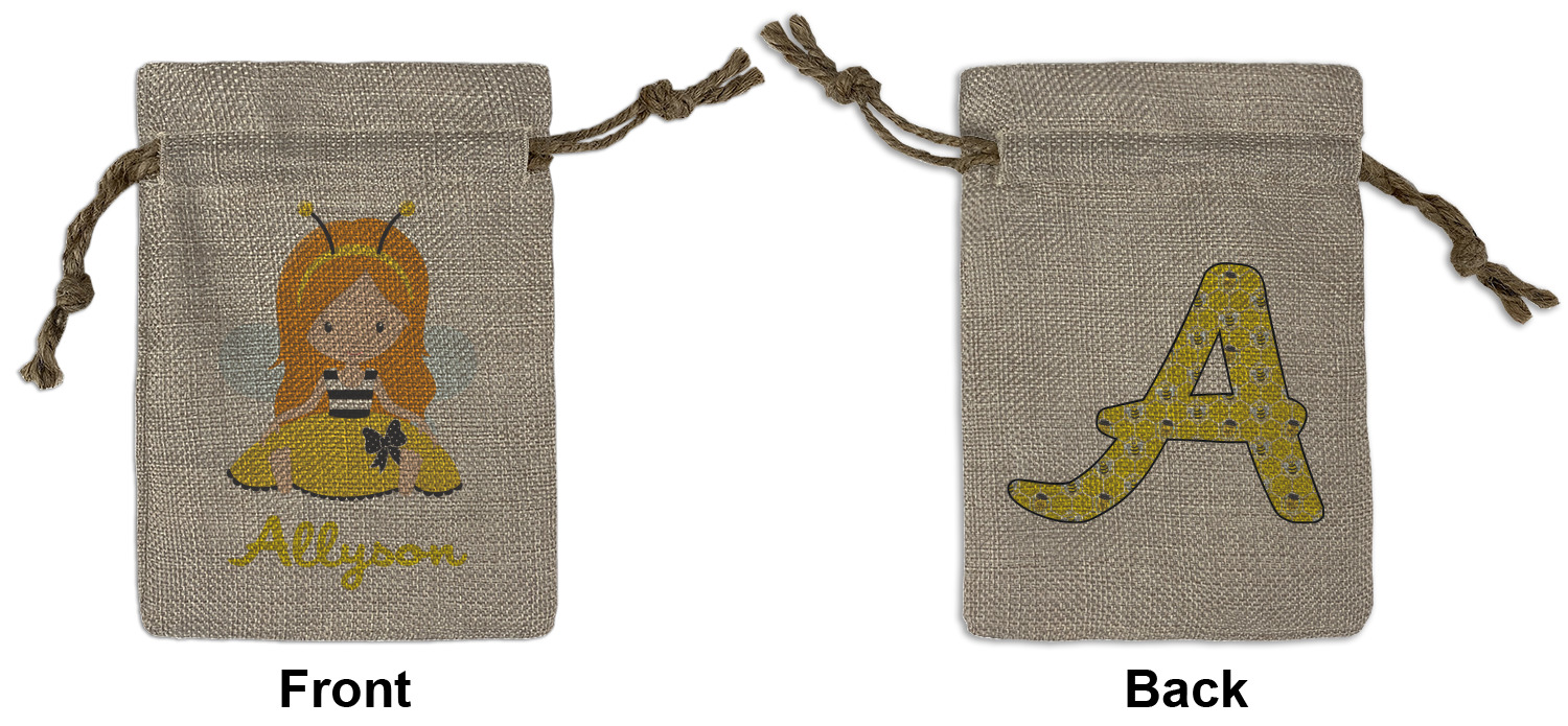 We sell our Burlap Gift Bags in 3 variant sized bags. Made with burlap polyester, each personalized bag can be secured with a twine drawstring pull. Your custom design is available to print on one side or both sides - completely up to you! The sizes of the bags measure approximately 4.5" x 6.5" for the smallest size, 6.5" x 8.0" for the medium size, and 6.5" x 13.5" for the large-sized bag.