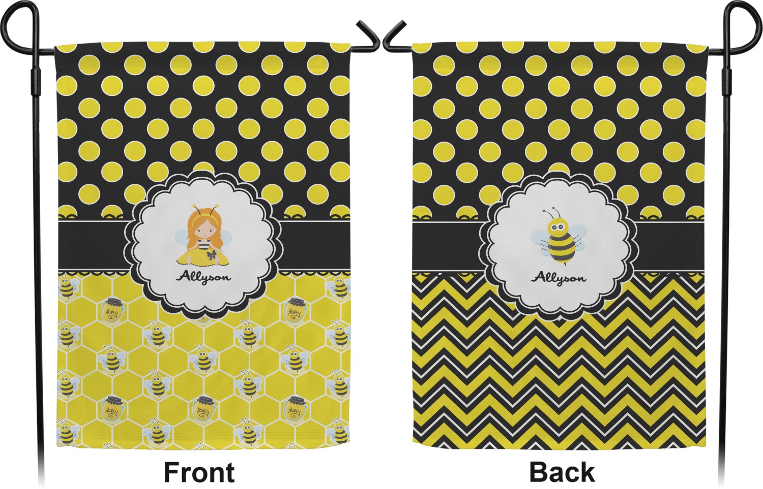 These custom garden flags are made of a durable, double-ply, polyester weave, allowing them to withstand the elements year round. The small flags measure at approximately 12 by 18 inches. The large flags measure out to 28 by 37 inches. You can order these decorative flags with your customization printed on the front only, or the front and back.