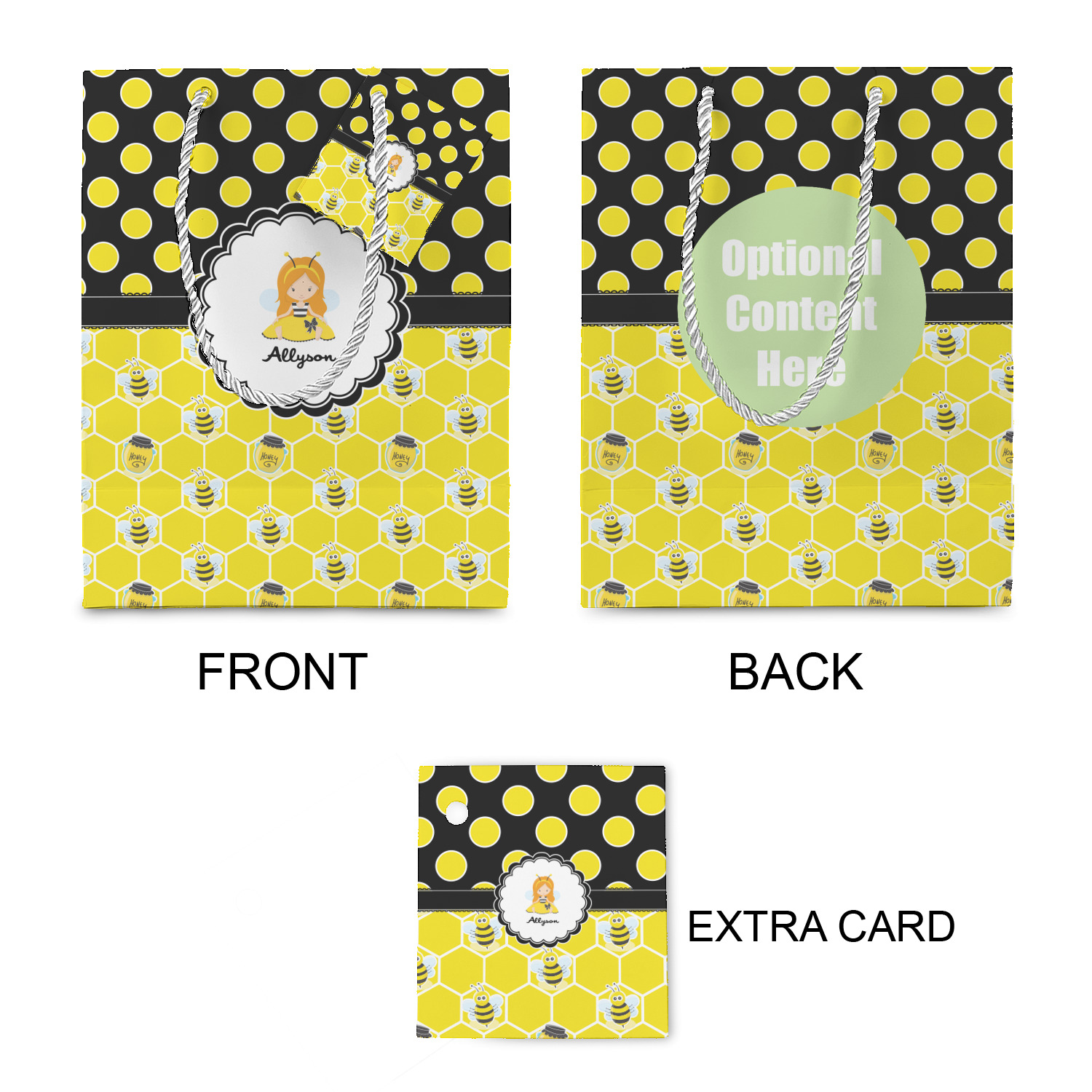 The bottom of the bag has a cardstock base to make the base more sturdy to hold up to all of your gifts. Each bag comes with one card on the rope handle and at least 1 extra card.