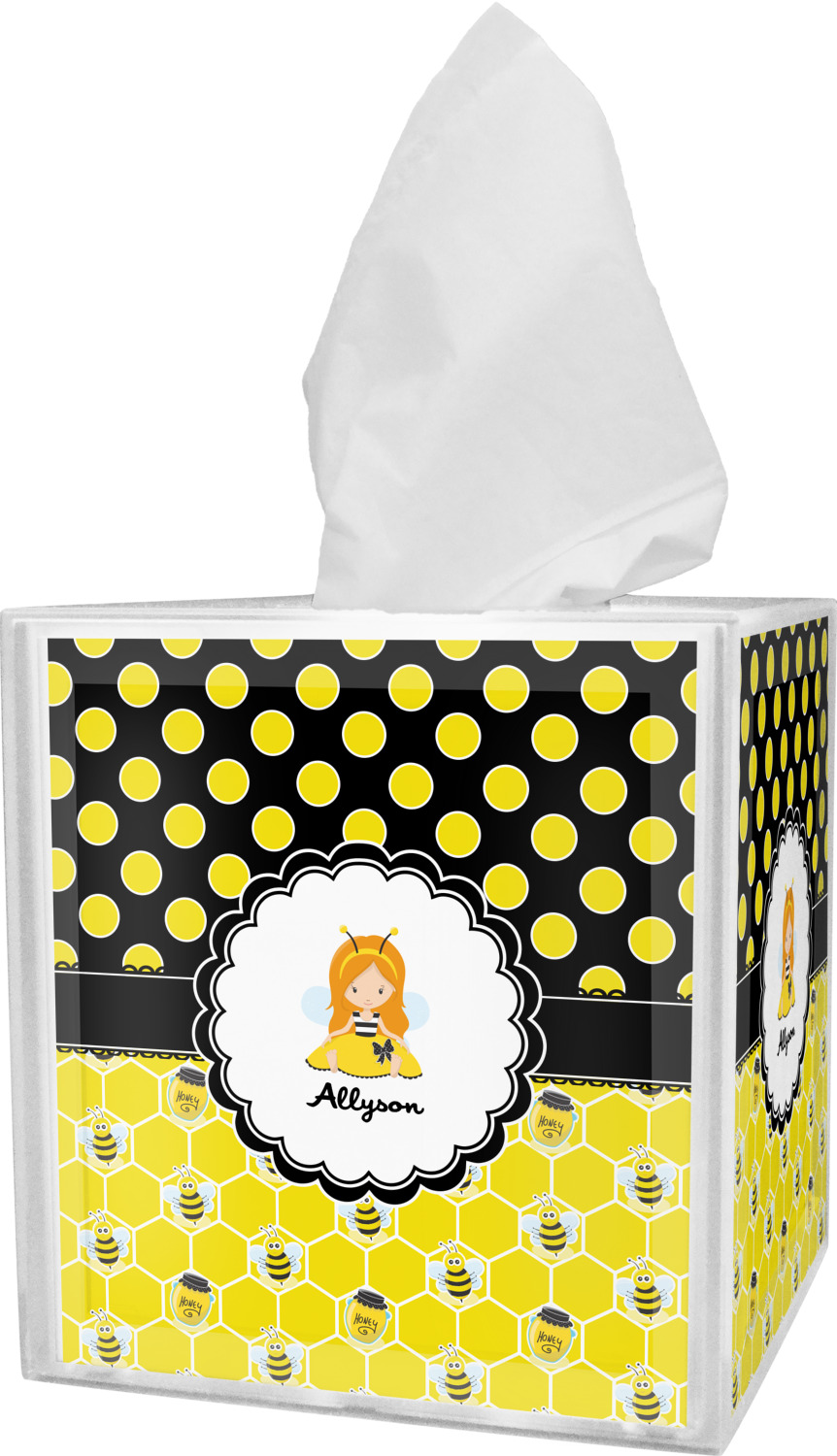 These tissue holders are built from durable acrylic and display your unique personalization on fine-quality vinyl inserts placed within the four sides and top. The box features two pieces, allowing you to easily switch out tissue boxes. On the sides, youll find ridges that ensure the top and base fit securely in place. The bottom of these tissue box holders has four, rubber, non-slip pads to prevent the box from scuffing any surface you decide to display it on. Each box can fit a standard 5 by 5-inch box of tissues.