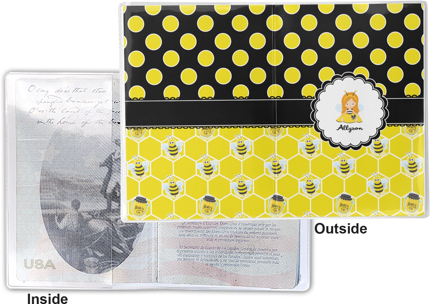 This cover is made of a sturdy clear vinyl with a personalized vinyl insert inside. There is a large and a small pocket on either side to hold the covers of your passport easily and firmly. The passport holder is approximately 7.5" x 5.25", the perfect size to snugly fit your passport. This slim cover is the perfect way to protect your passport without being one more bulky item you have to carry.