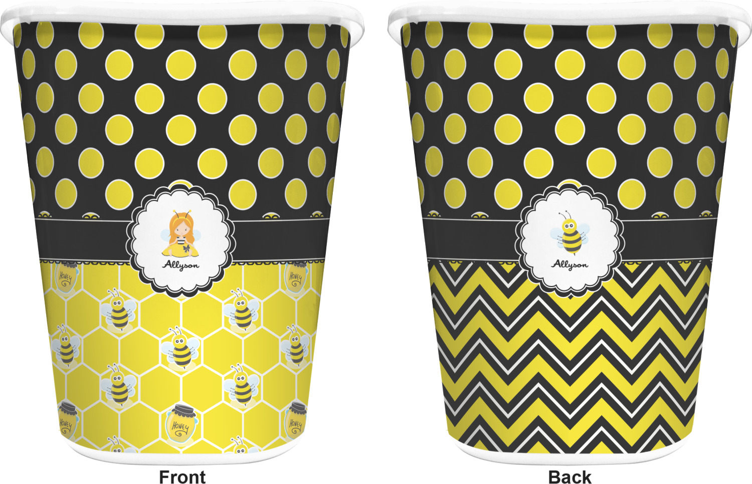 You can choose to purchase these decorative wastebaskets in either a white or a black color that will show on the base and the upper rim. Your customization is printed on a high-gloss, fine-quality vinyl adhesive, and you can choose to either have this adhesive applied to one side only or to both sides. As such, this plastic wastebasket can be single-sided or double-sided, depending on your creative vision. Your customization is printed using durable inks, making the design waterproof and resistant to fading over time.