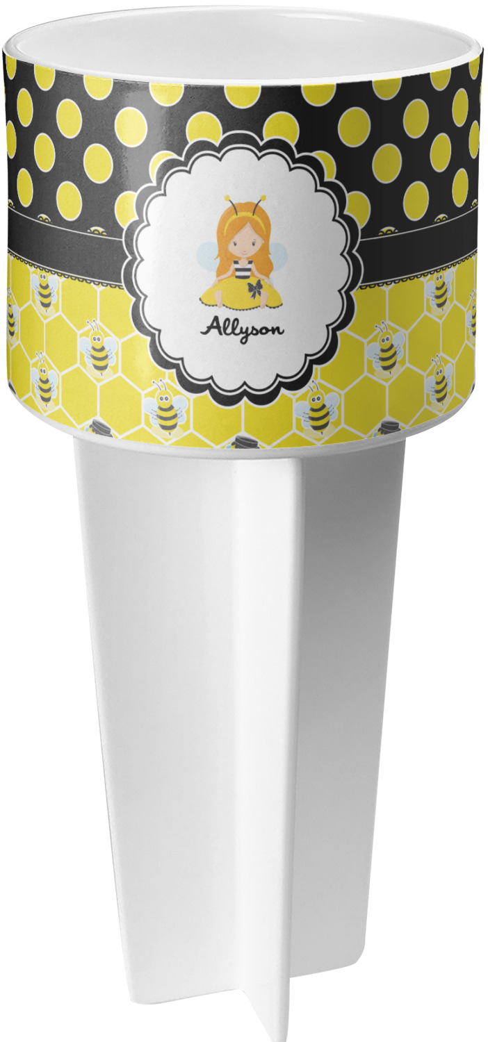 This cup holder has a large stake at its bottom that anchors it to the sand or ground below, while the cup holder rests above the stake. The entire drink holder is made of durable plastic and displays your customization around the cup holder portion. We sell these personalized beach spikers in two different colors: black and white.