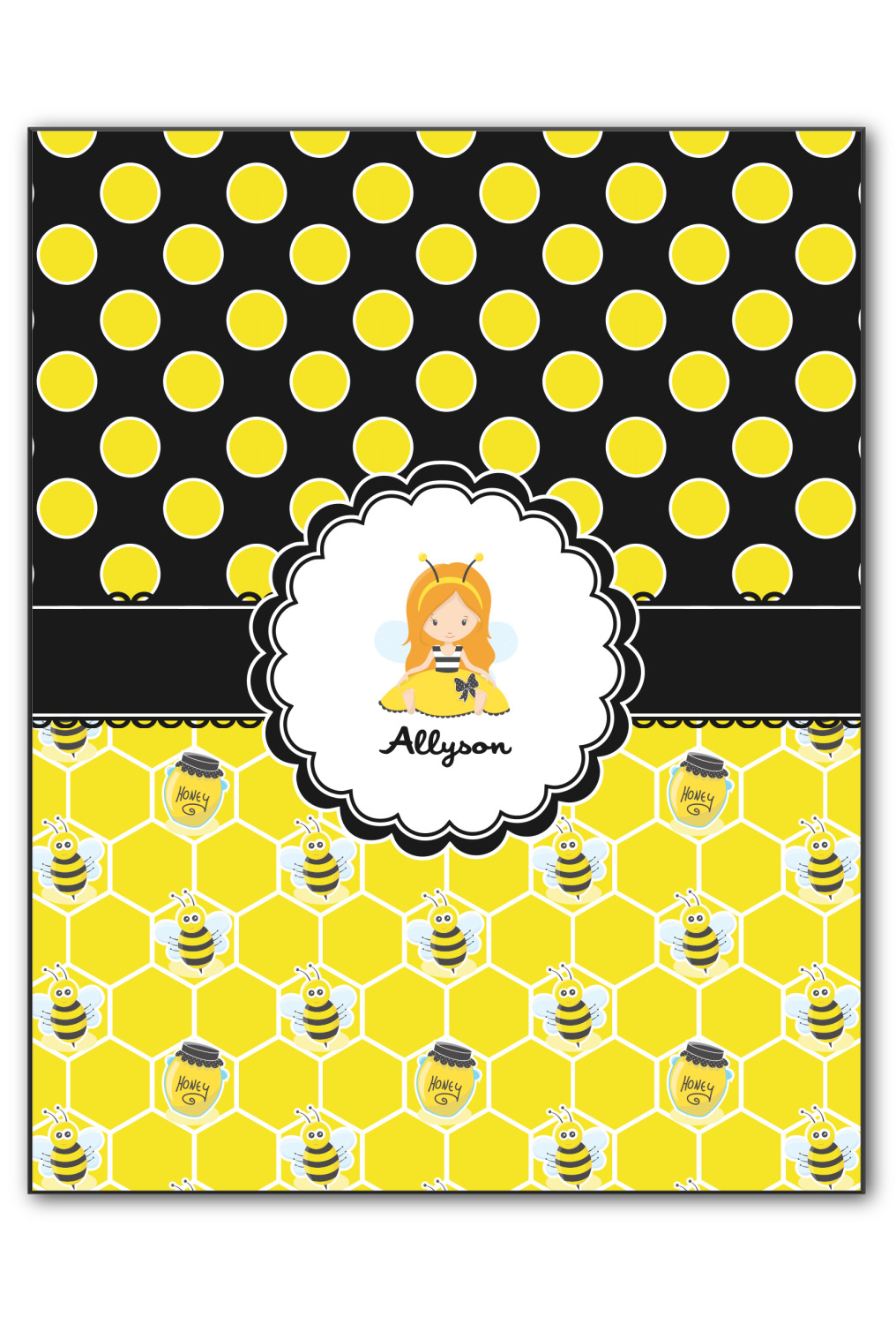 A wide lace black ribbon separates the pattern and connects a beautiful black trimmed white decorative label that provides a focal point for either a little bumble-bee or a bumble-bee obsessed girl and his/her name. As a special touch, personalize your little bumble-bee girl's hair and skin color.