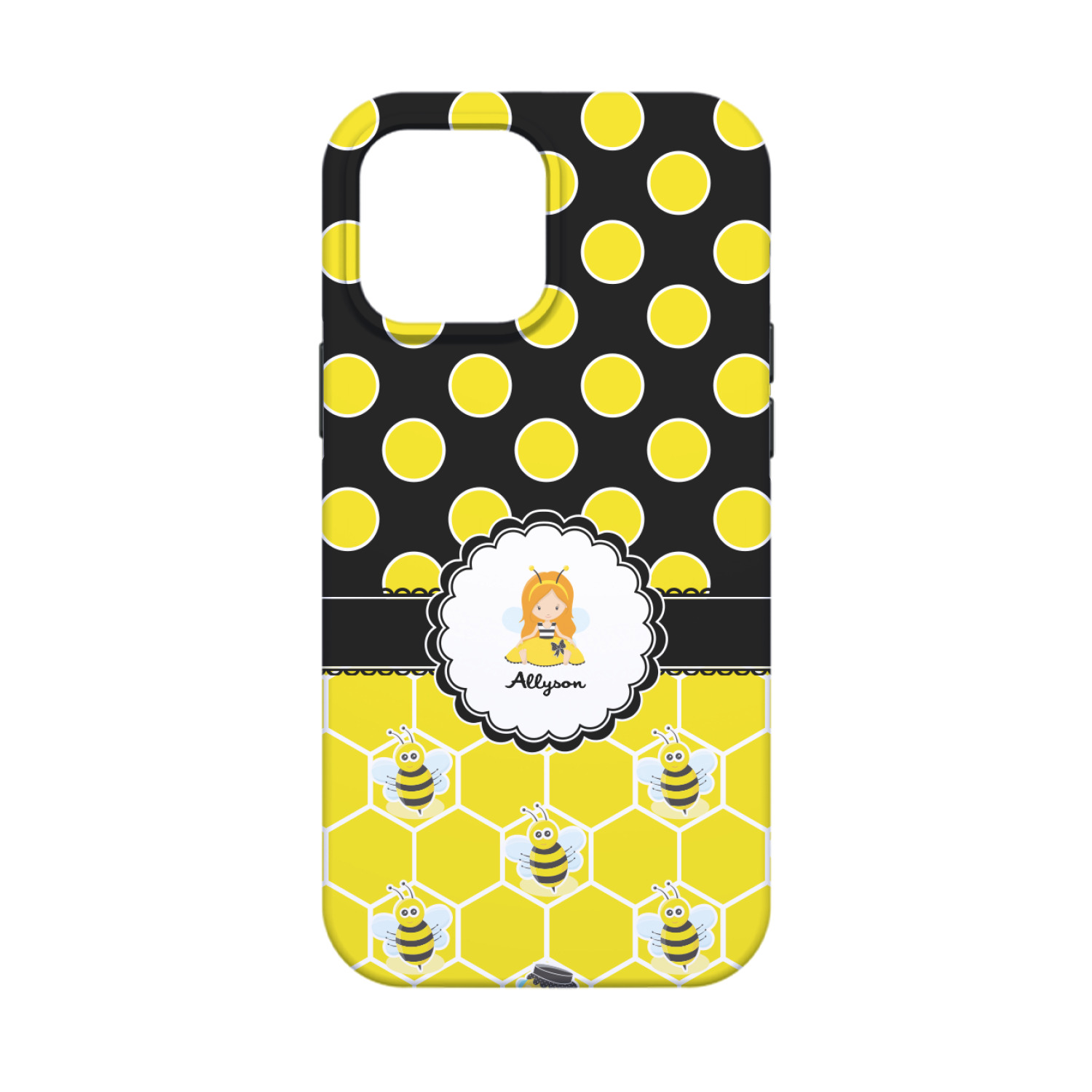 A wide lace black ribbon separates the pattern and connects a beautiful black trimmed white decorative label that provides a focal point for either a little bumble-bee or a bumble-bee obsessed girl and his/her name. As a special touch, personalize your little bumble-bee girl's hair and skin color.