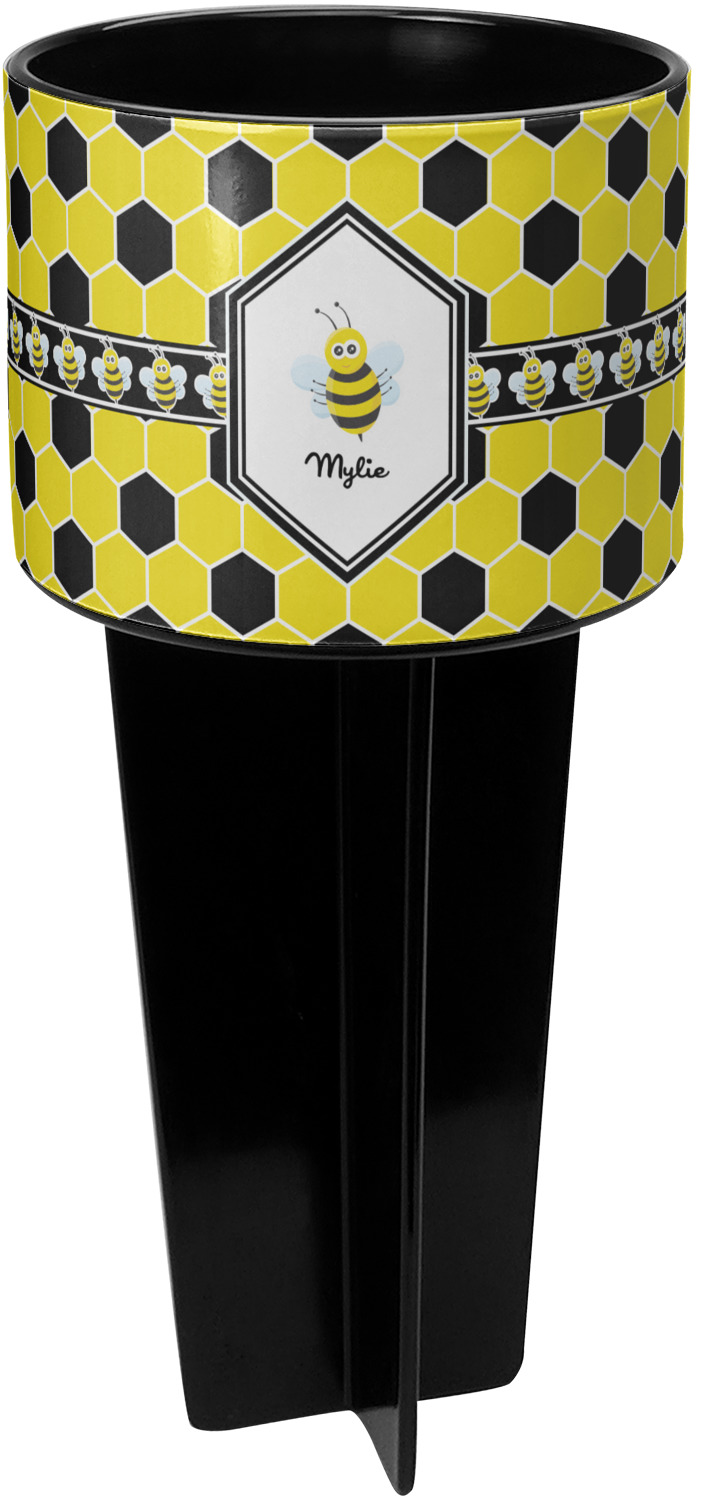 This cup holder has a large stake at its bottom that anchors it to the sand or ground below, while the cup holder rests above the stake. The entire drink holder is made of durable plastic and displays your customization around the cup holder portion. We sell these personalized beach spikers in two different colors: black and white.