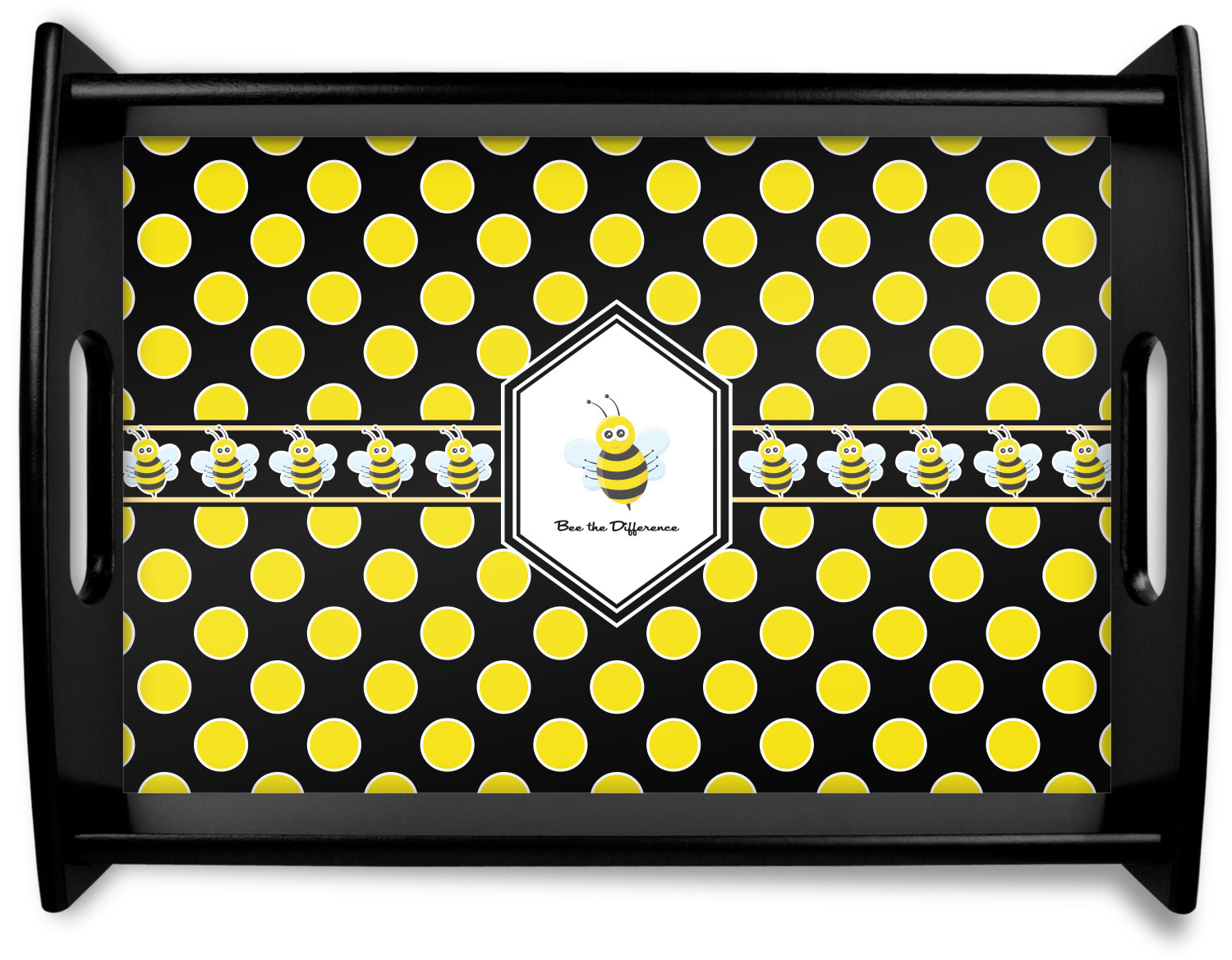 This serving tray with handles features square edges and two rounded sides, creating a very modern look. Each side is fabricated from a beautifully cut, natural wood. The bottom of the interior of the tray displays your customized design in bright, vibrant color. The tray is sold in both a black color and a natural wood look. Each variation of the wood serving tray has two sizes: Small, which is 14" x 10" x 2.25", and Large, which is 19.5" x 13.5" x 2.75".