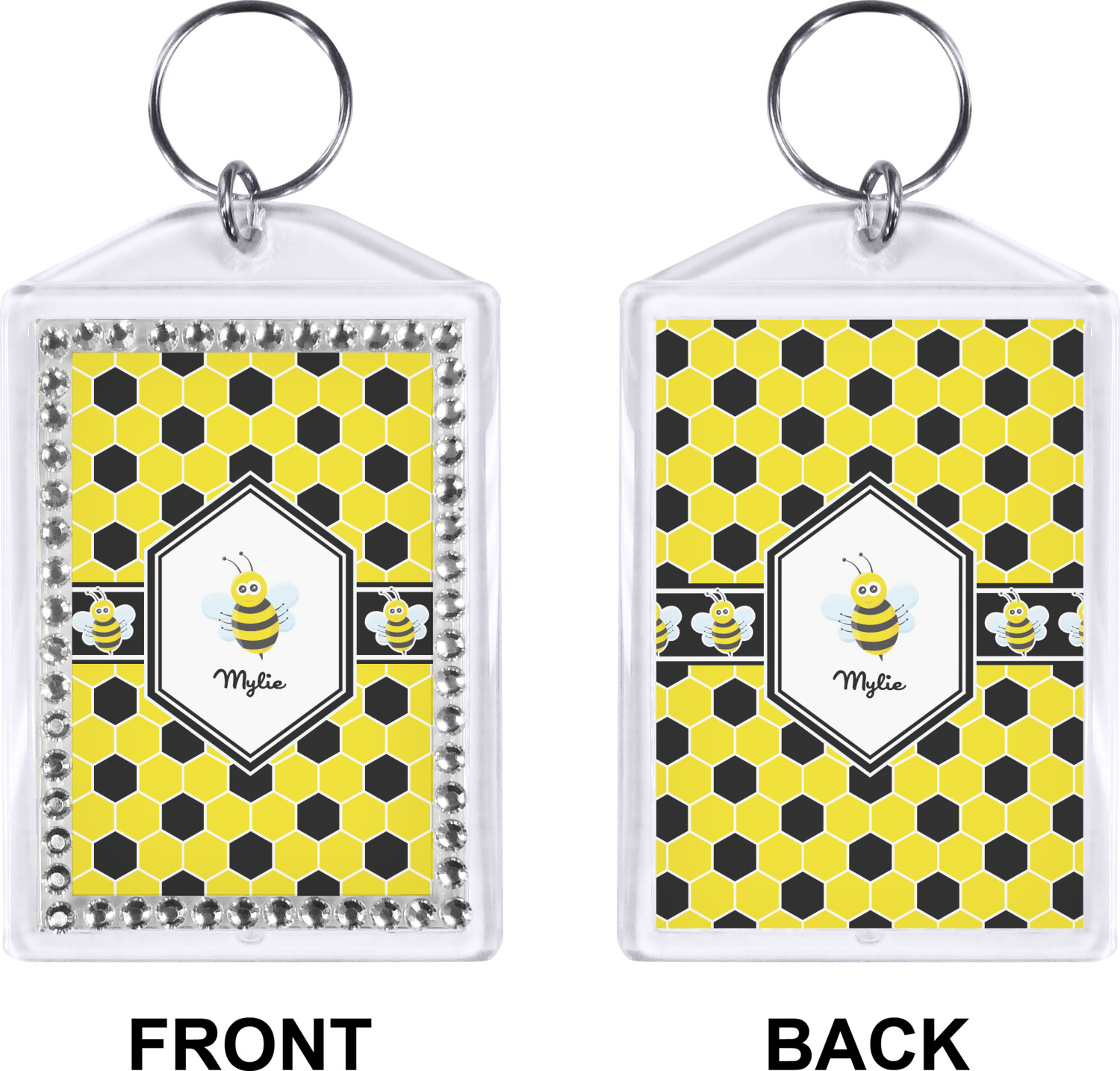 Our personalized keychains have a bold, rectangular shape, outlined by a series of shimmering rhinestones. A metal, split keyring is included with your purchase, and an additional metal hoop allows for attachment of the keychain to the split ring. This unique keychain measures at about 3.75 by 2.5 inches. We print your customized design(s) across both the back and front of this keychain.