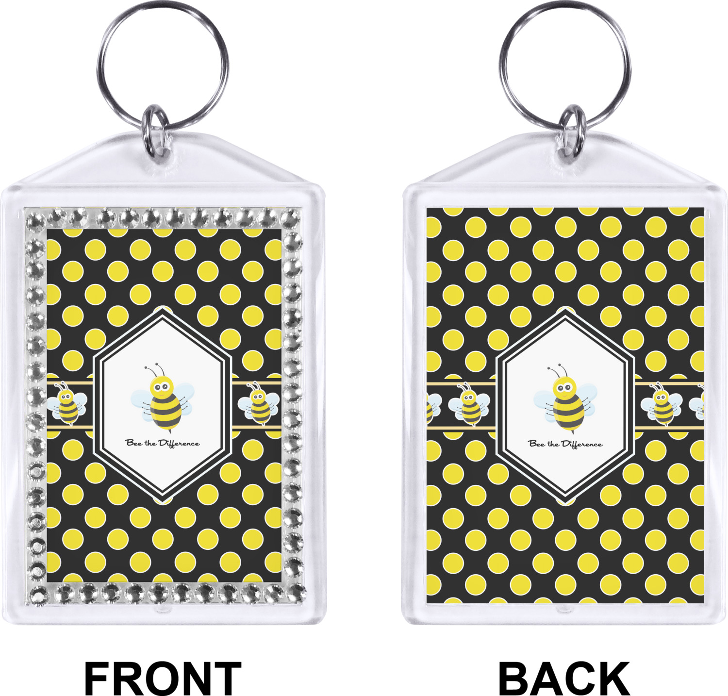 Our personalized keychains have a bold, rectangular shape, outlined by a series of shimmering rhinestones. A metal, split keyring is included with your purchase, and an additional metal hoop allows for attachment of the keychain to the split ring. This unique keychain measures at about 3.75 by 2.5 inches. We print your customized design(s) across both the back and front of this keychain.