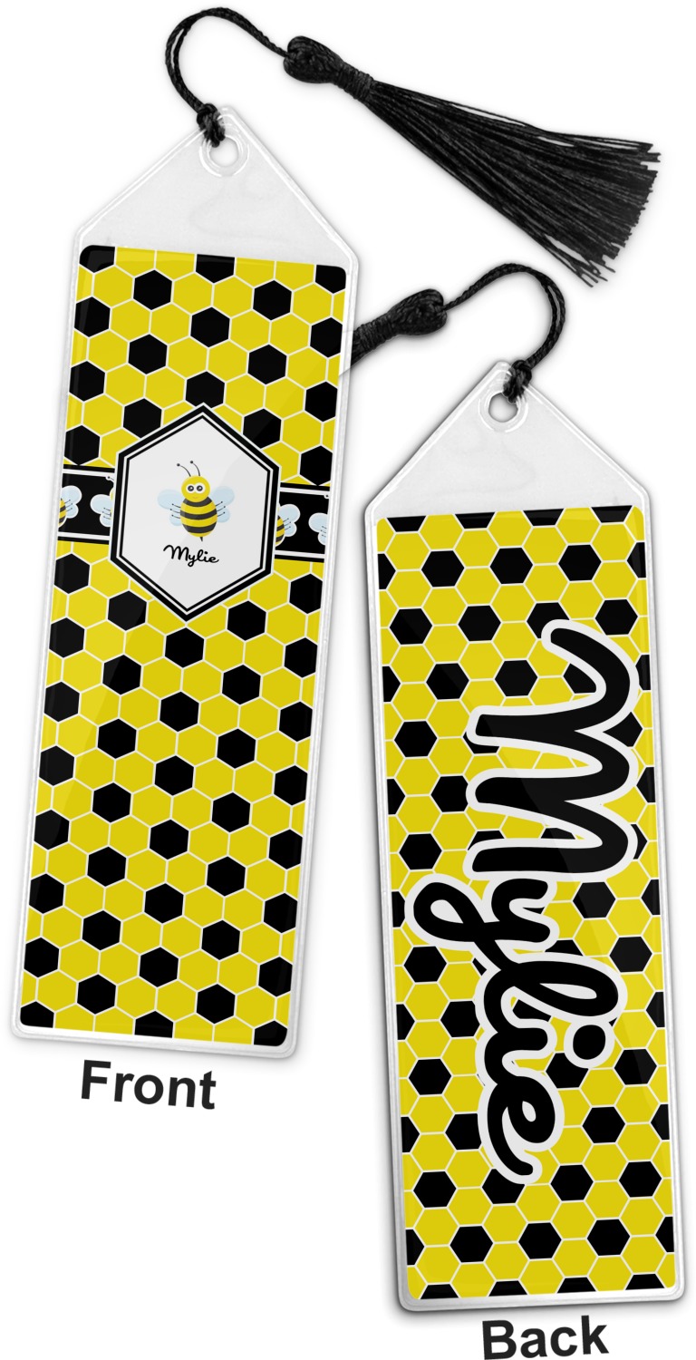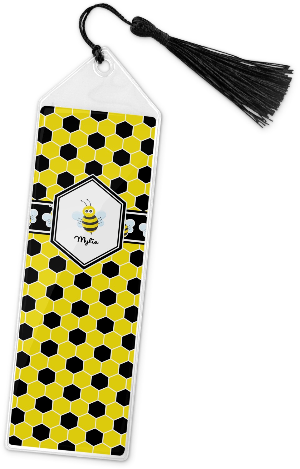 Your personalized bookmark is made of a sturdy, clear vinyl, and is approximately 7.5" x 2.25". We display your personalization on vinyl inserts that are placed on both sides. Accompanying each book marker is a black, fringe tassel that attaches to the reinforced, triangular header.