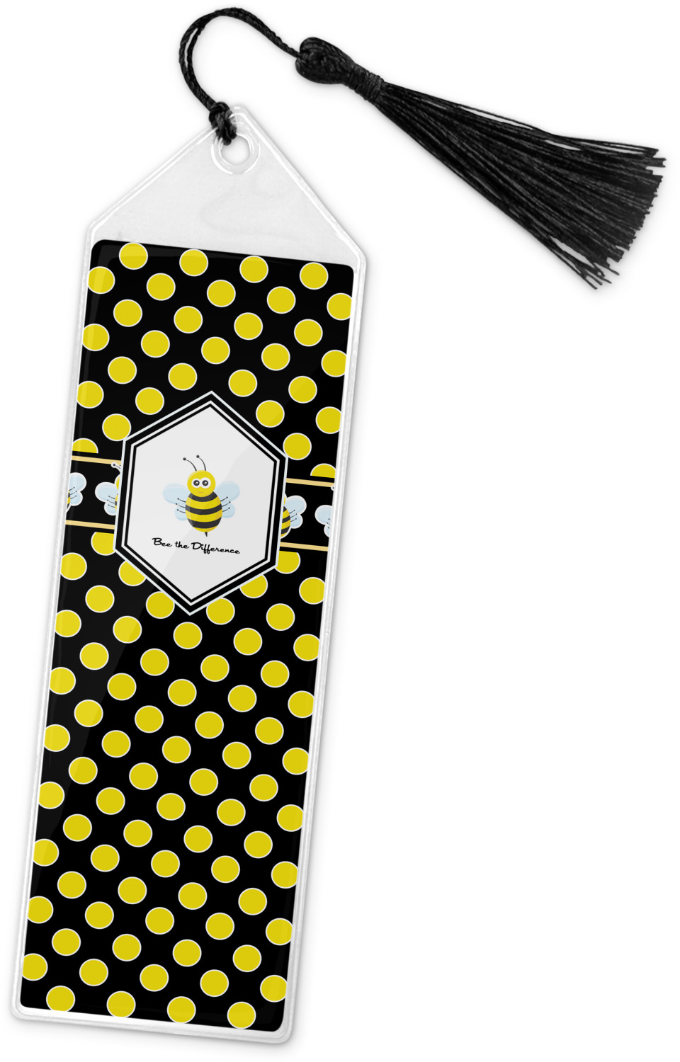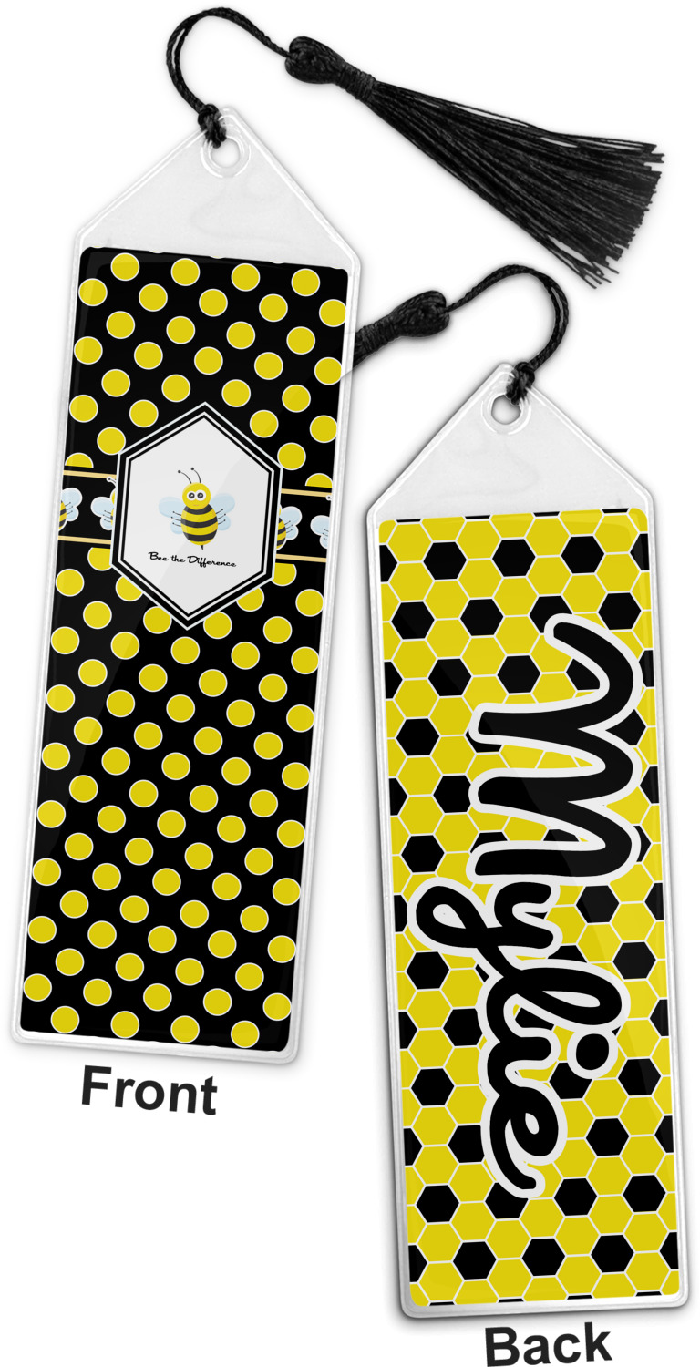 Your personalized bookmark is made of a sturdy, clear vinyl, and is approximately 7.5" x 2.25". We display your personalization on vinyl inserts that are placed on both sides. Accompanying each book marker is a black, fringe tassel that attaches to the reinforced, triangular header.