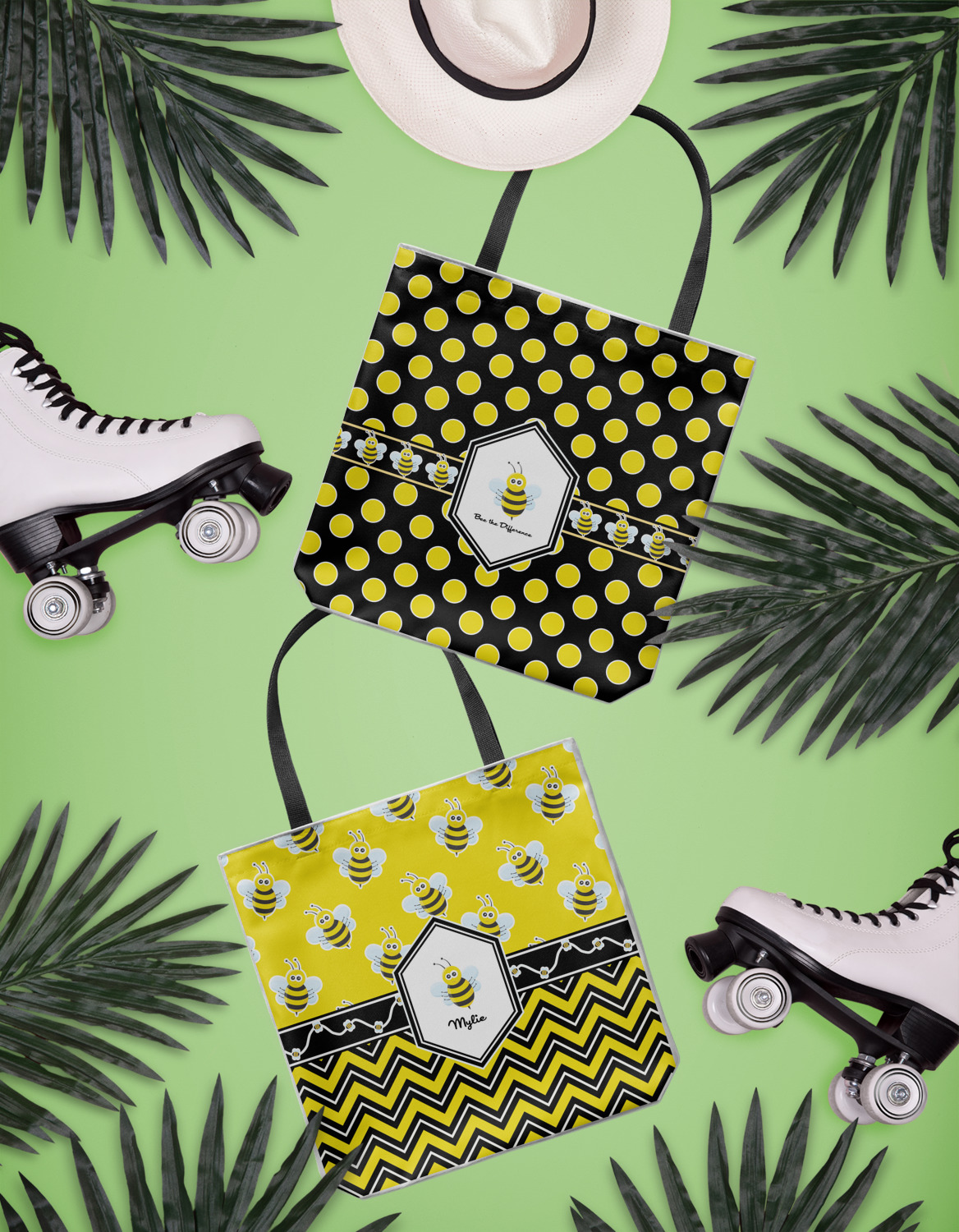 Our totes are made right here in the USA. Your design is printed on canvas fabric; the fabric is then cut and sewn on the sides and on the bottom to add an approximately 3.5 inch gusset. Black cotton handles are sewn in and reinforced. Your tote has a designs on both sides - the designs can be the same or different - the choice is yours. The inside of the tote has a black fused lining.