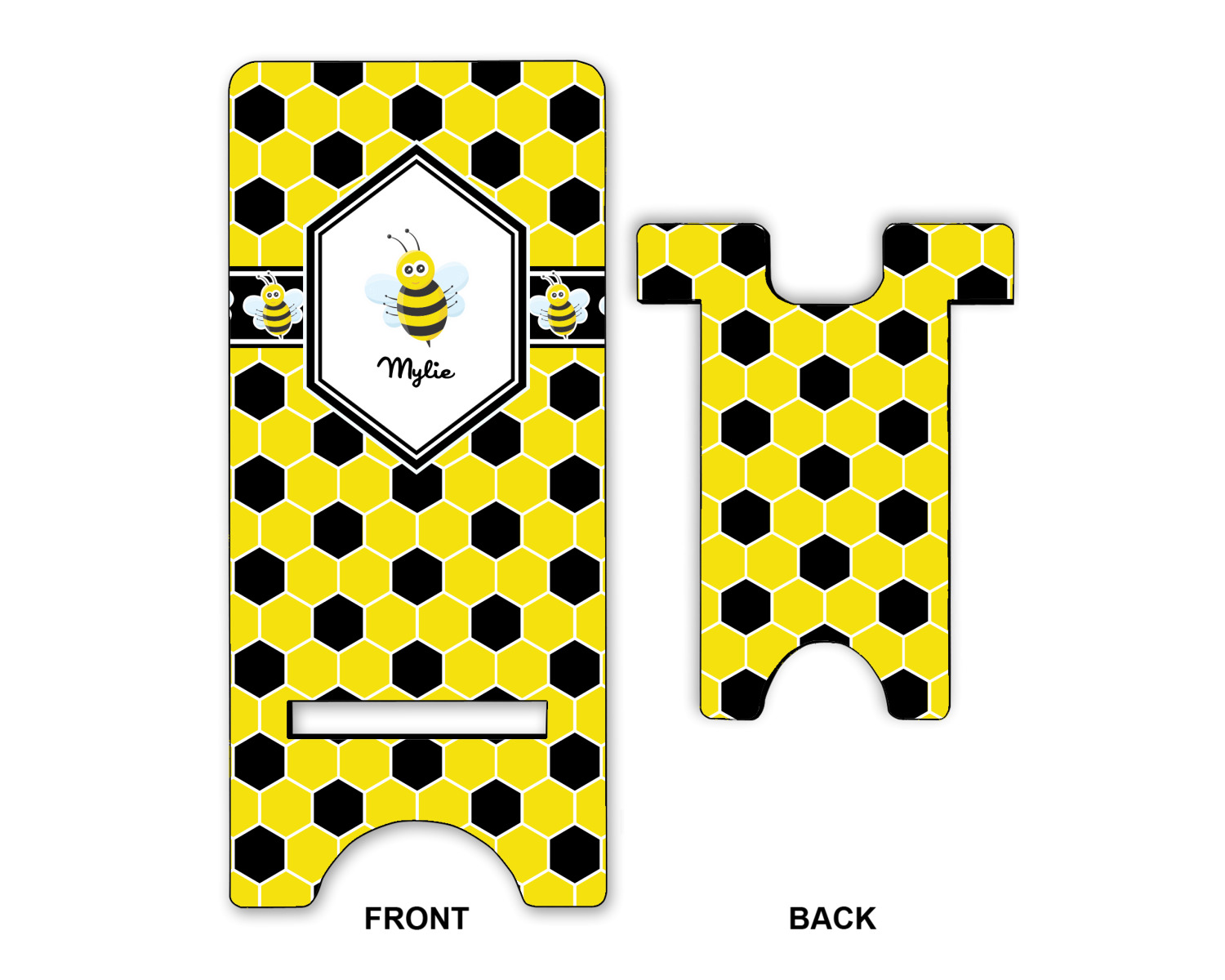 These cell phone holders are comprised of two hardboard pieces, that lock into and steady one another. The bottom part of the mobile phone stand is spacious enough to support both your phone and your charger, while it is not in use. We print your customization atop the face of this stand, while the remaining sides are a sophisticated, black color.