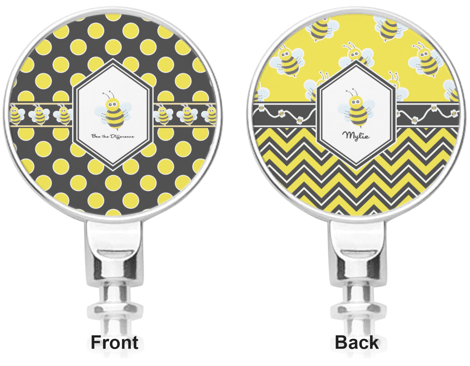 A wide white trimmed black ribbon is the background for a conga line of bees. A white decorative label that is trimmed in double rows of black will provide the focal point for your little bumble bee and his or her name.