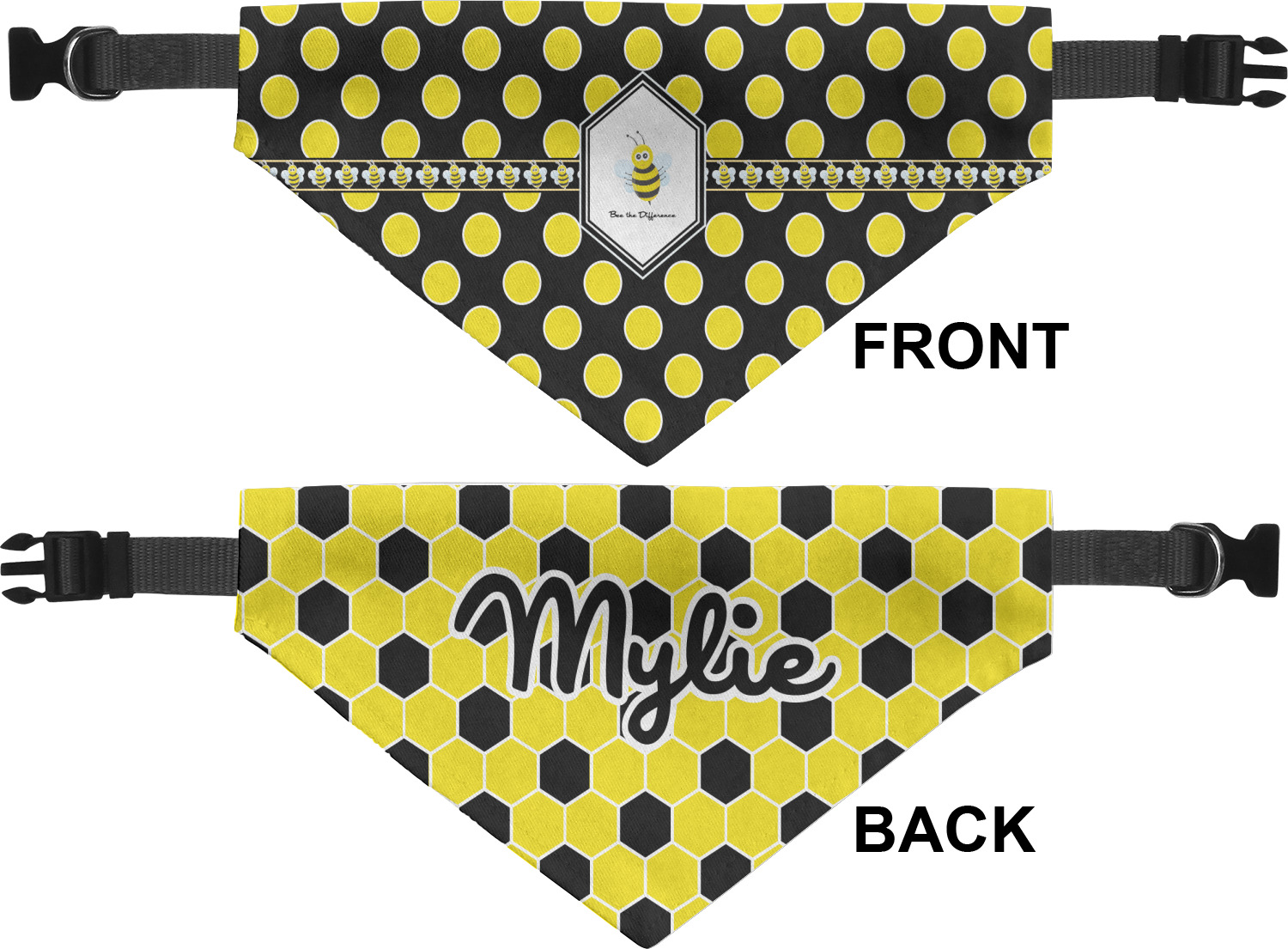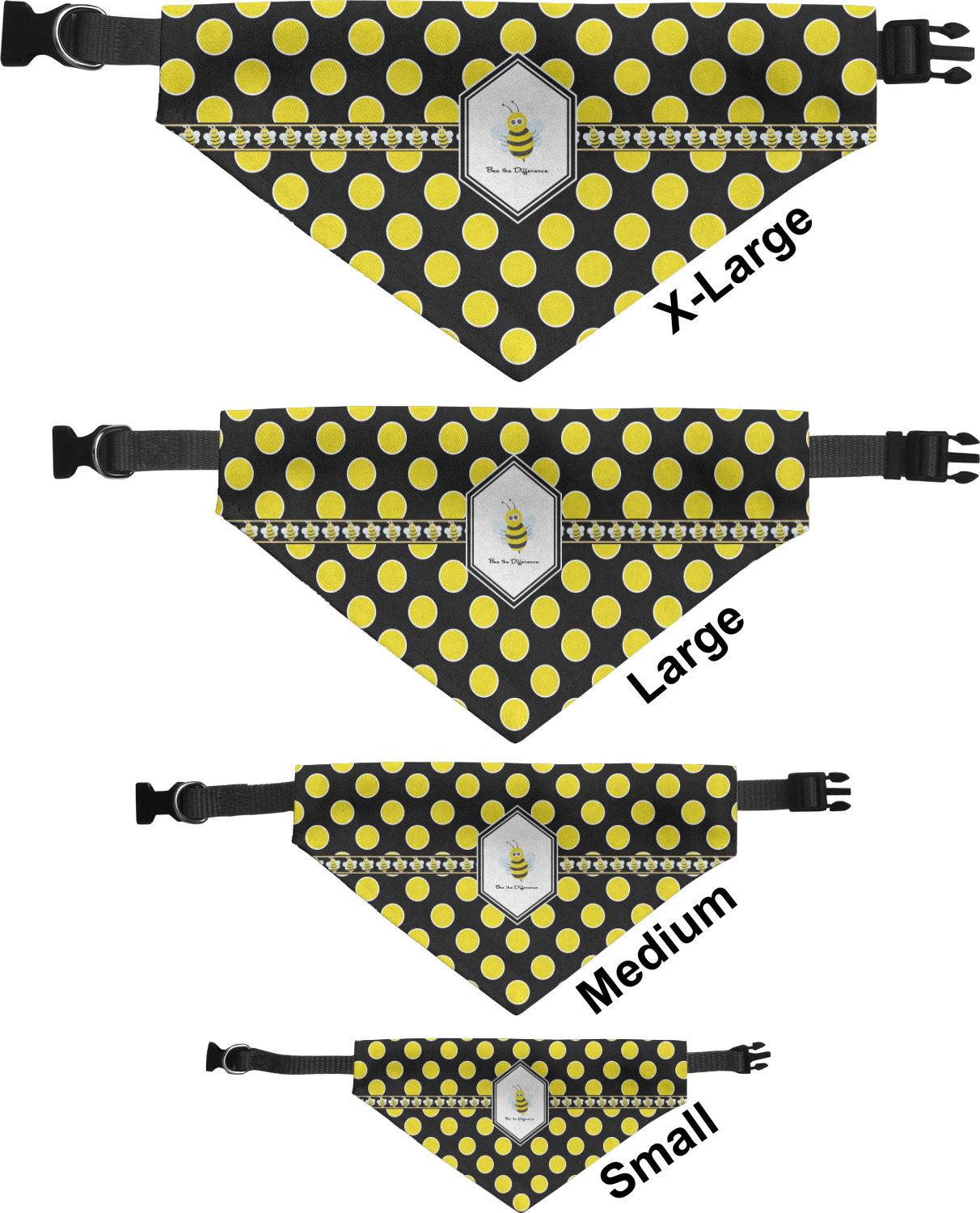 We print the front and back of these dog bandanas with your customized design. The bandana itself is made from a durable polyester, sewn together with a gap large enough to accommodate any collar. Regardless, the bandana includes a plain black, canvas collar with plastic snaps, that can easily be removed if desired. These dog bandana collars are available in four sizes: small, medium, large, and extra large. Please see our sizing chart for more information regarding the dimensions of each size.