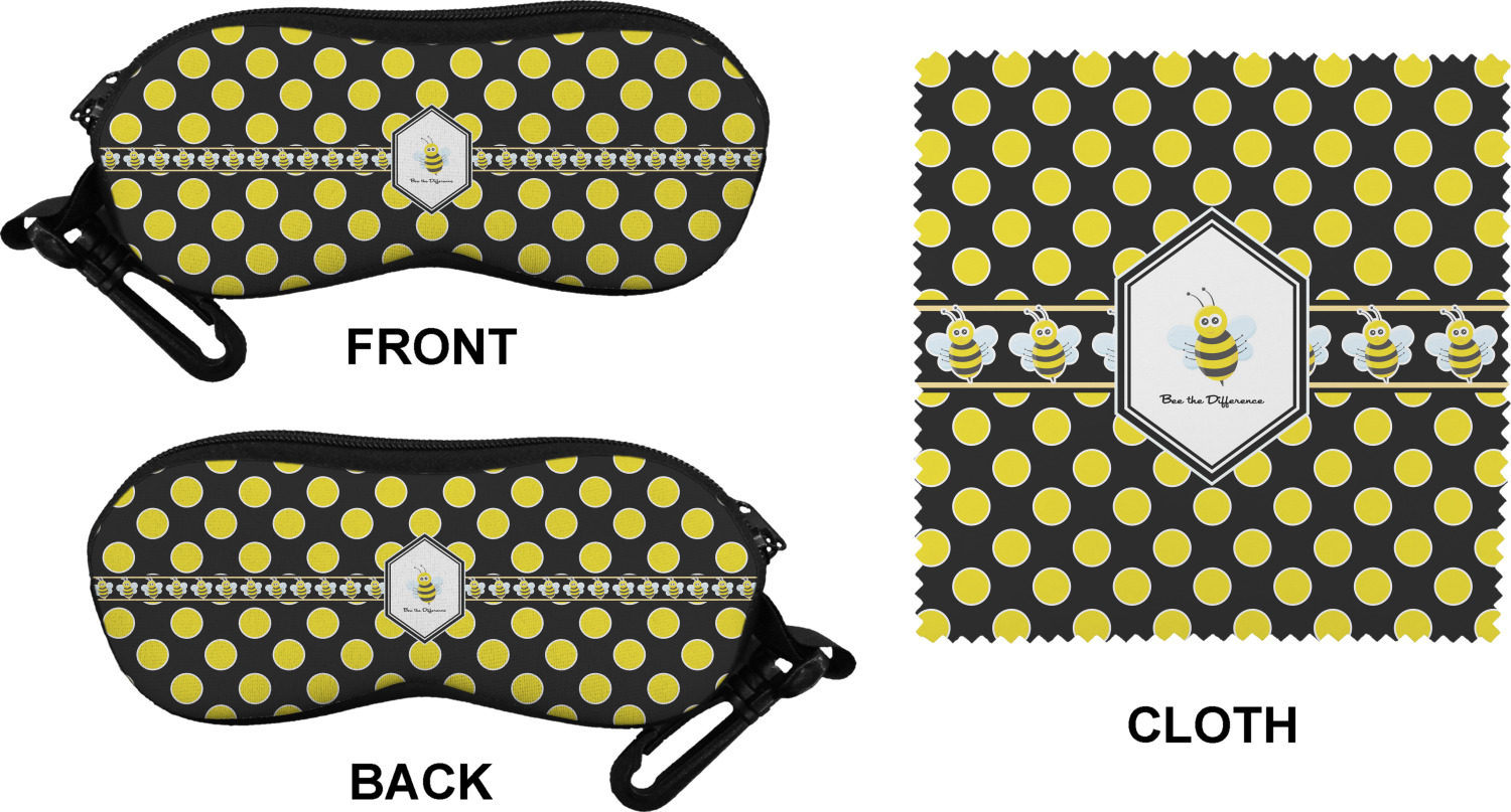 The cases have the design on both sides, a black zipper, and clips for hanging on a belt buckle or purse strap and also include matching lens cloths.