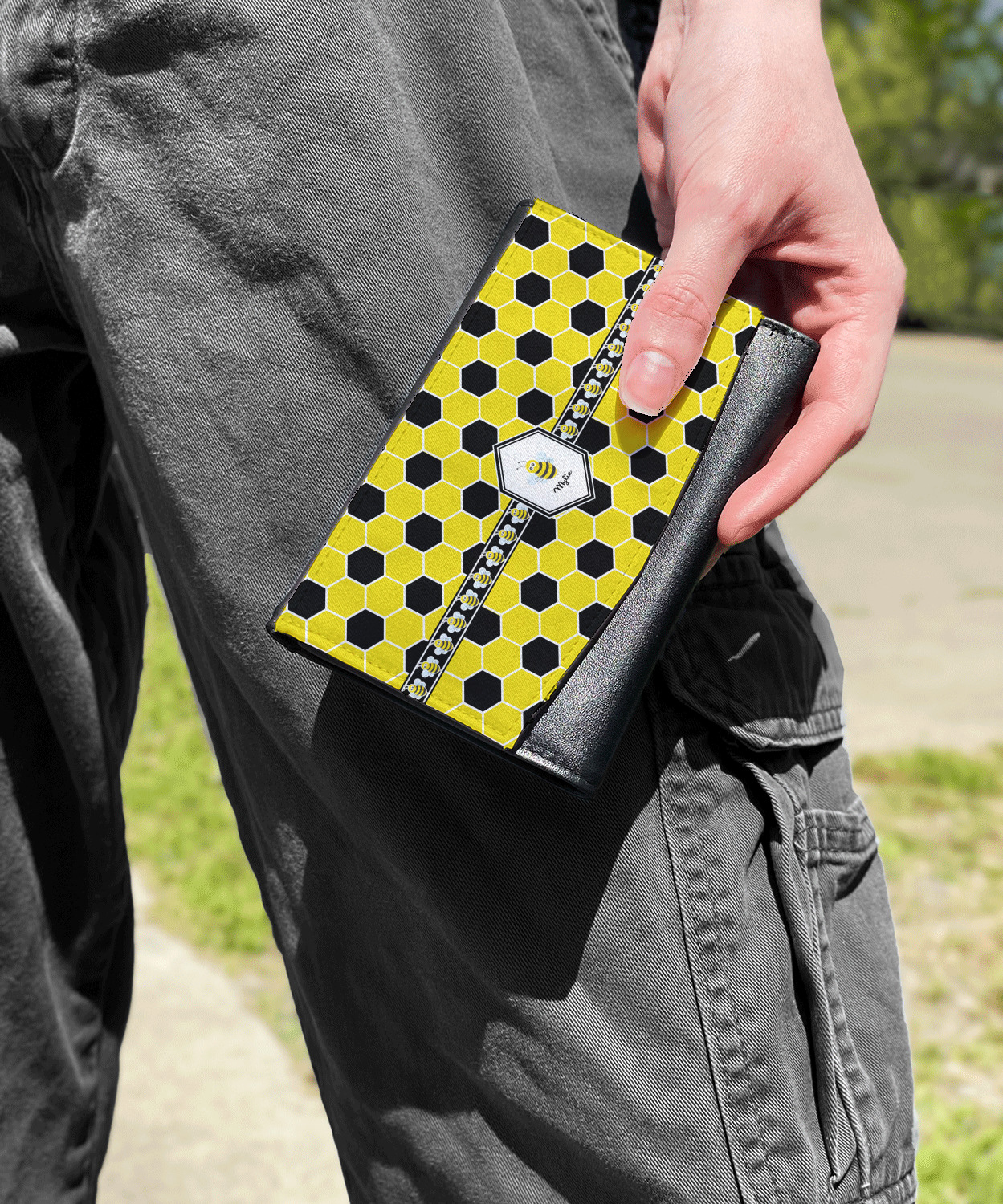 The compact size of this wallet - 5.5in wide, 3.5in tall and 0.75in thick when folded - makes it perfect to hold in hand and small enough to fit in a clutch or a normal size purse. The outside flap is customized with your choice of artwork and closes with a snap closure - with two different snaps to allow it to be adjusted when storing more items - to securely fasten the flap.