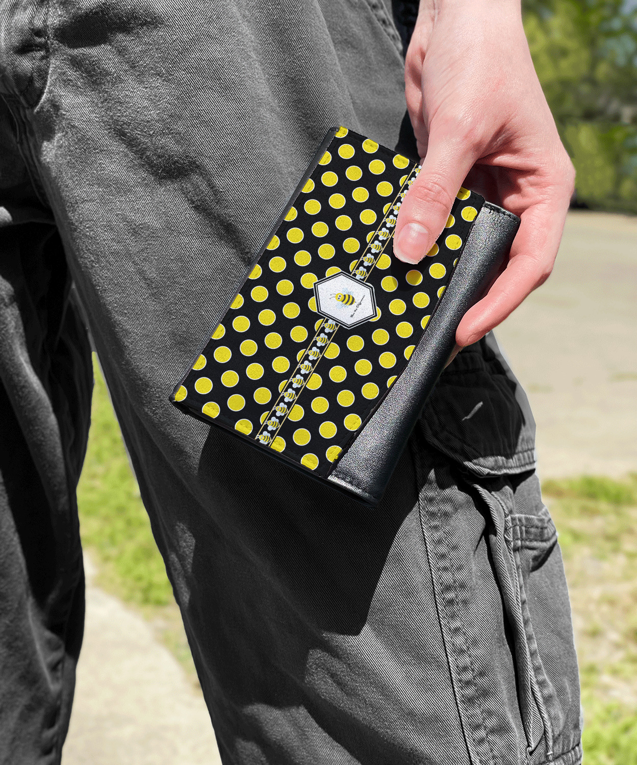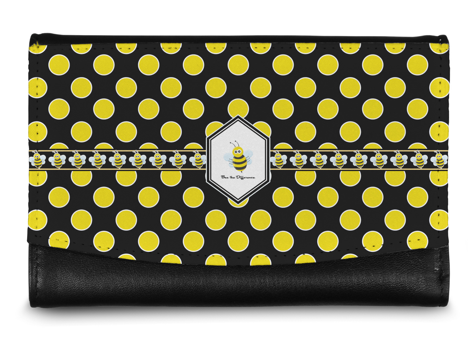 The compact size of this wallet - 5.5in wide, 3.5in tall and 0.75in thick when folded - makes it perfect to hold in hand and small enough to fit in a clutch or a normal size purse. The outside flap is customized with your choice of artwork and closes with a snap closure - with two different snaps to allow it to be adjusted when storing more items - to securely fasten the flap.