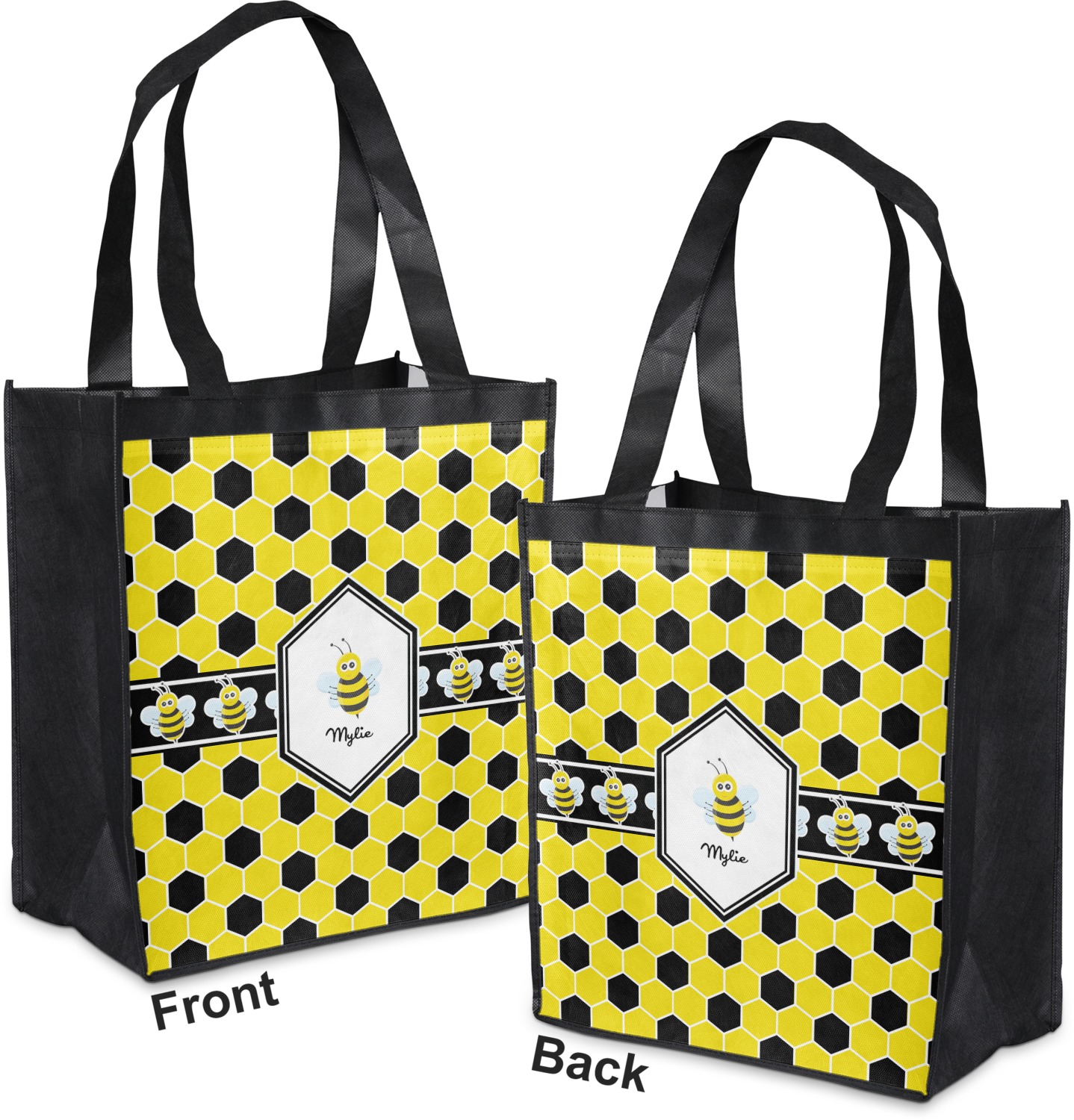 Made from a durable, biodegradable material, these reusable shopping bags can support up to 30 pounds of weight. With two large handles, measuring at 8.5 inches each, these personalized tote bags are easy to carry to your vehicle or home. The bag itself is 12 by 13.5 inches, and can expand to a depth of 7 inches. Your customization is printed on both the front and back, while the remaining sides, trim, and handle are a sleek, charcoal black.