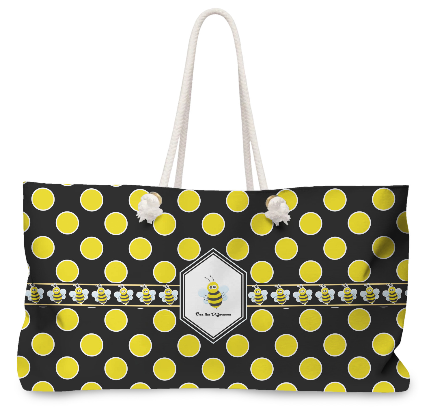 Our oversized weekender tote with rope handles is perfect for your weekend at the beach or on the town. This large tote are 24" W X 13" H, with a 5" gusset and a 27" thick rope handles with a knot that is put through a grommeted brass hole.
