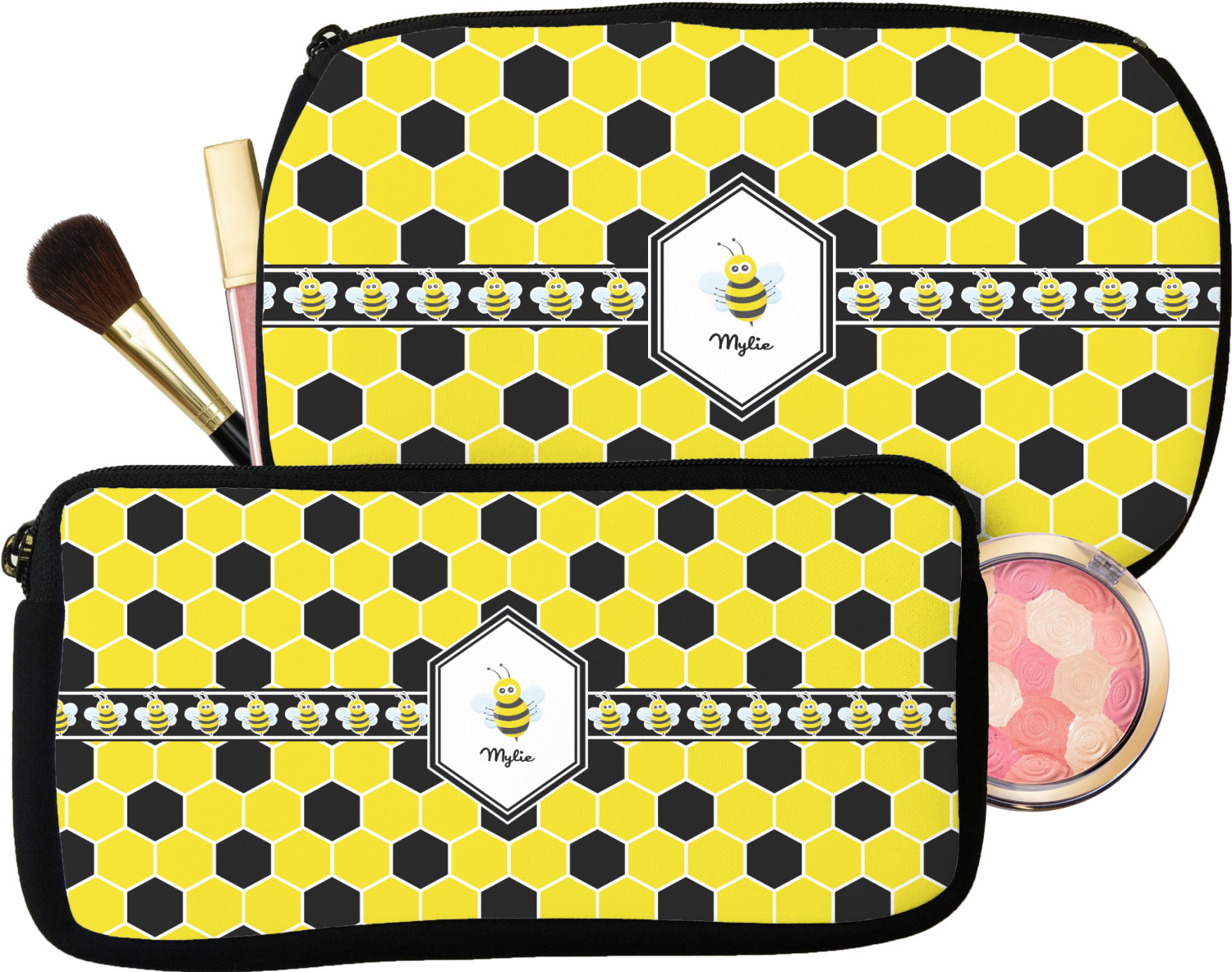 Our personalized makeup bags are available in many different designs, patterns and colors - so you are sure to find one that will love. They are made of neoprene (same material as wet-suits) and thus are water resistant, so spillages in your makeup bag will not end up all over you purse. They are customized on one side and are black on the other side and the zipper is black as well.