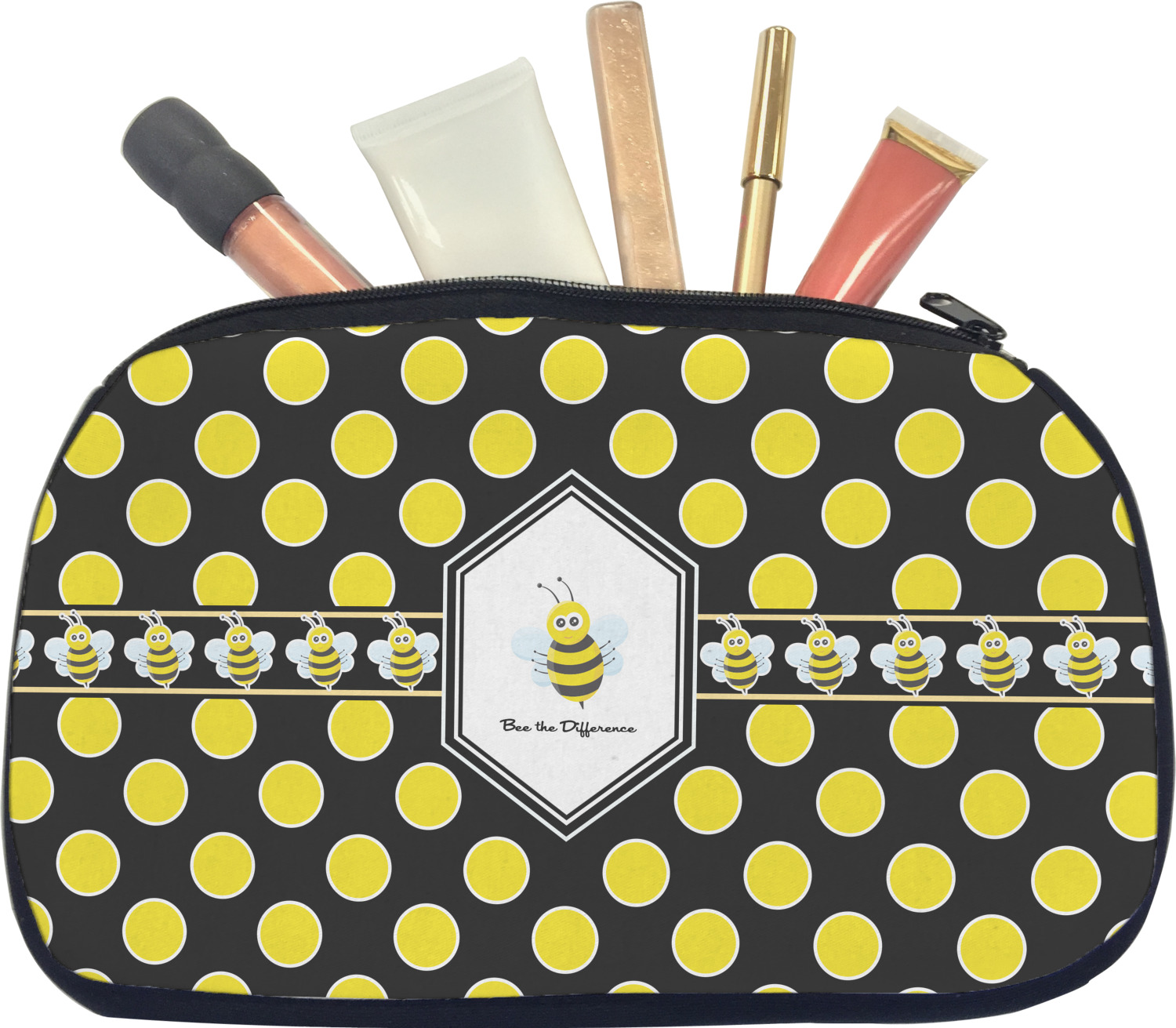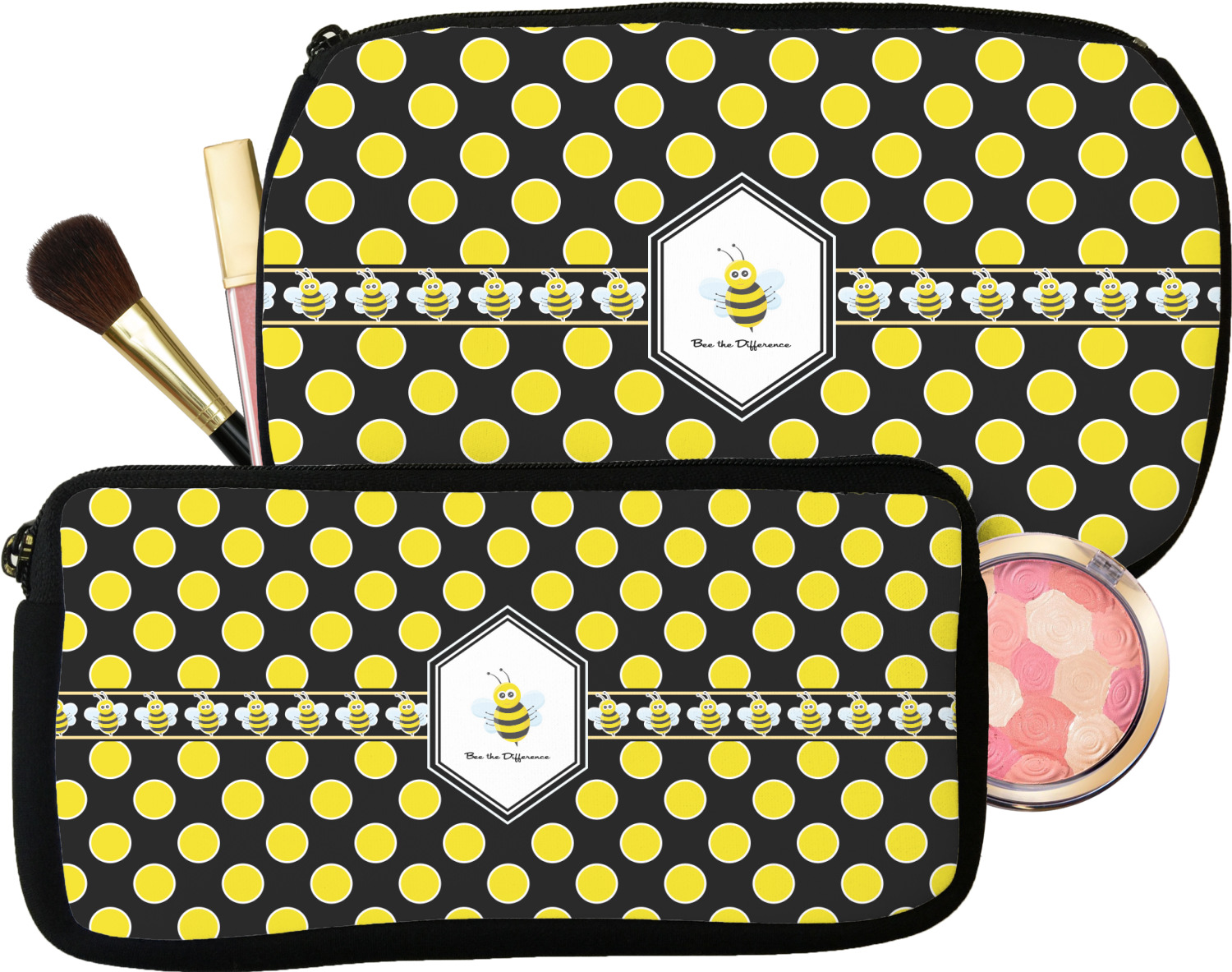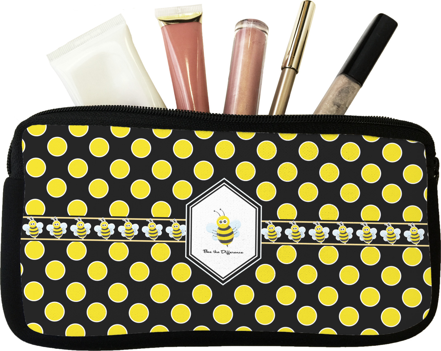 Our personalized makeup bags are available in many different designs, patterns and colors - so you are sure to find one that will love. They are made of neoprene (same material as wet-suits) and thus are water resistant, so spillages in your makeup bag will not end up all over you purse. They are customized on one side and are black on the other side and the zipper is black as well.
