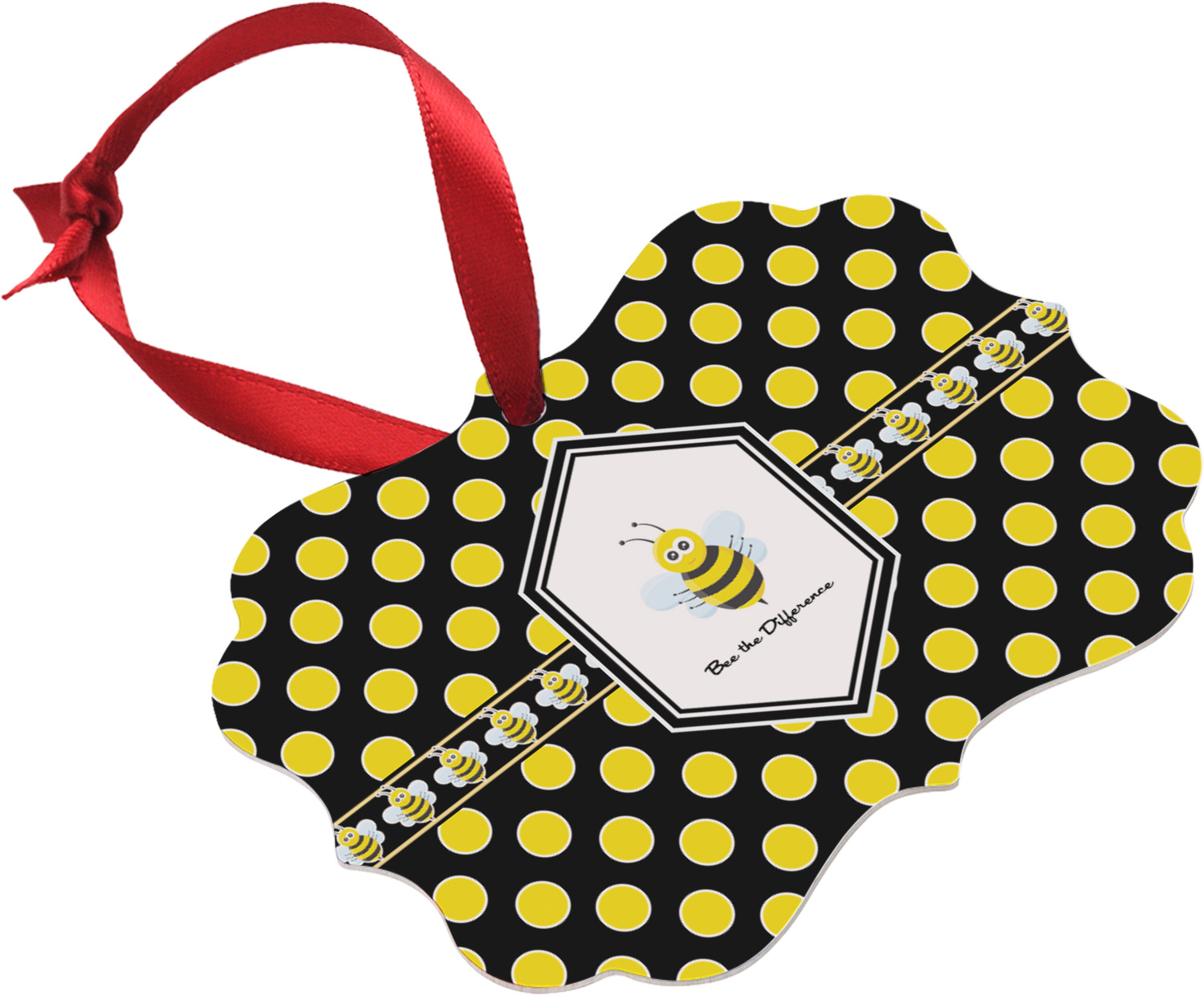 A wide white trimmed black ribbon is the background for a conga line of bees. A white decorative label that is trimmed in double rows of black will provide the focal point for your little bumble bee and his or her name.