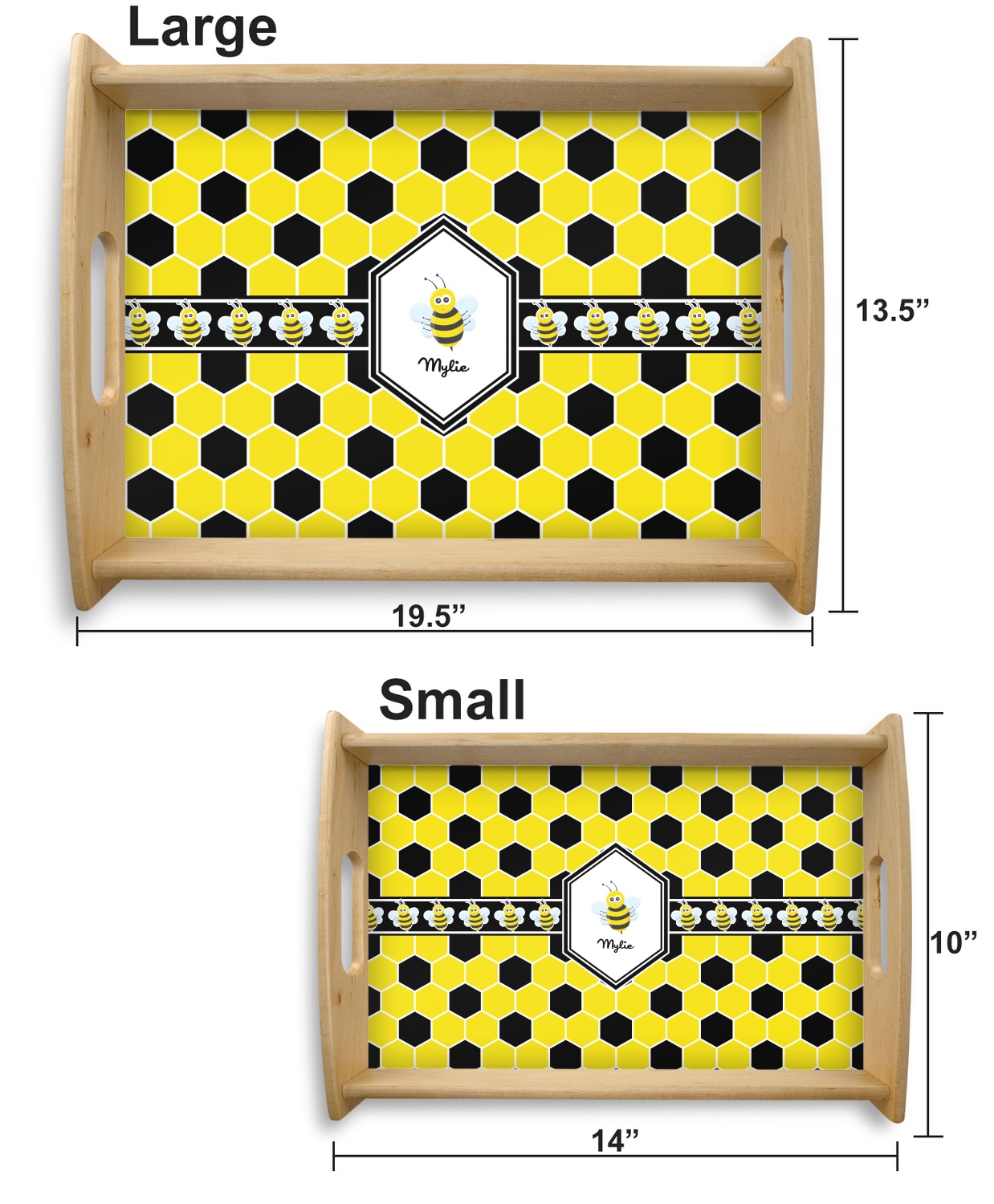 This serving tray with handles features square edges and two rounded sides, creating a very modern look. Each side is fabricated from a beautifully cut, natural wood. The bottom of the interior of the tray displays your customized design in bright, vibrant color. The tray is sold in both a black color and a natural wood look. Each variation of the wood serving tray has two sizes: Small, which is 14" x 10" x 2.25", and Large, which is 19.5" x 13.5" x 2.75".