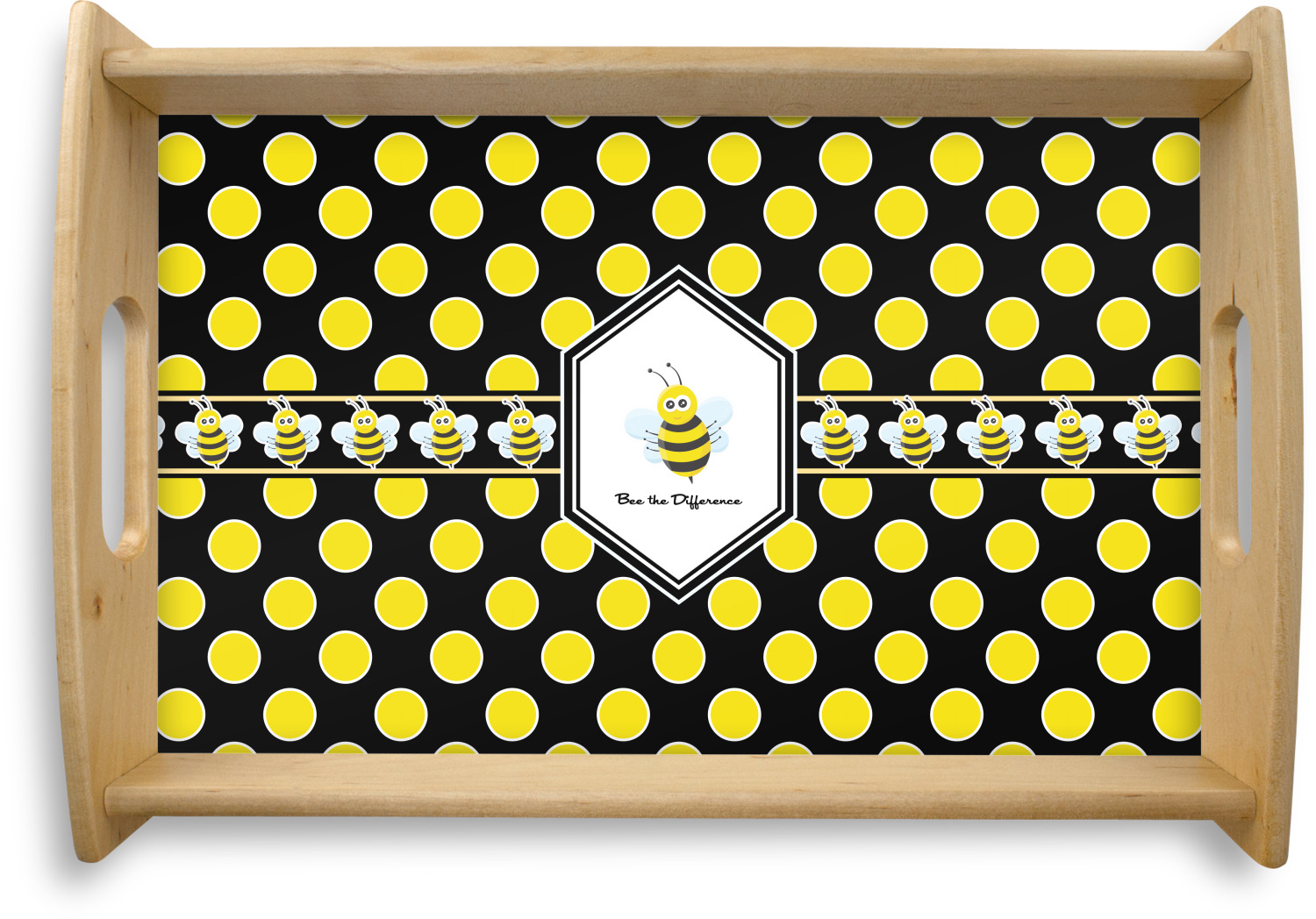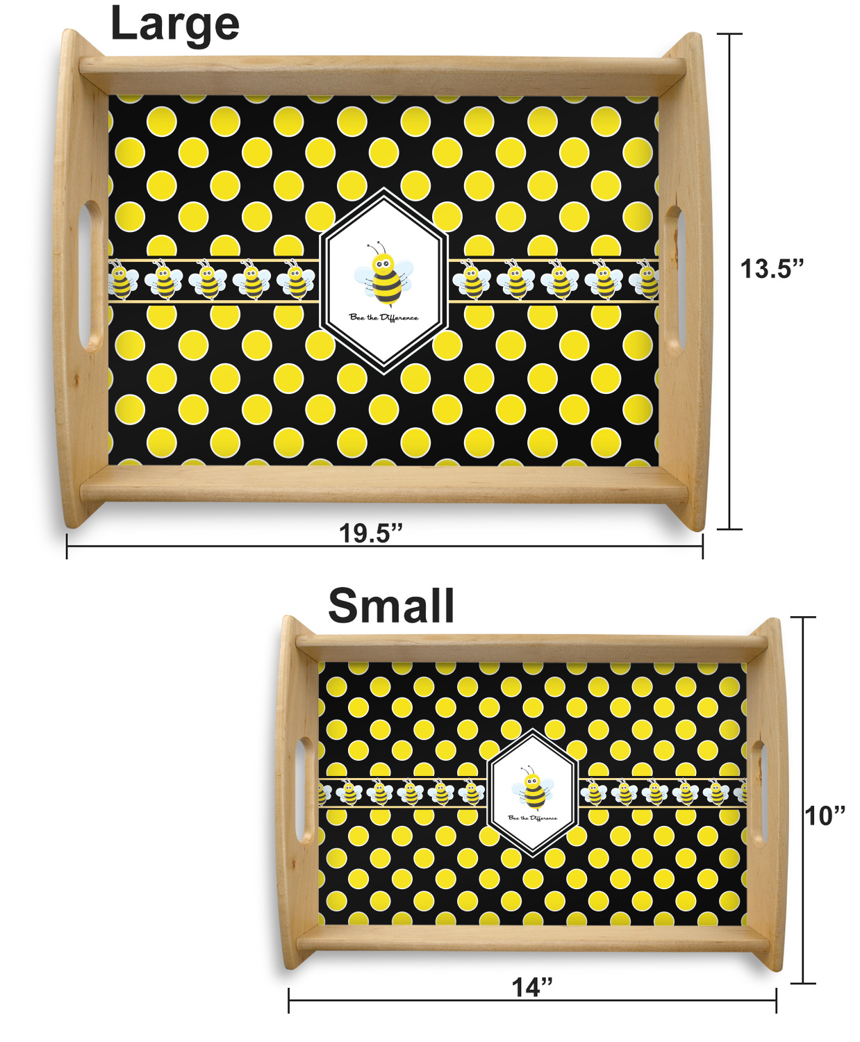 This serving tray with handles features square edges and two rounded sides, creating a very modern look. Each side is fabricated from a beautifully cut, natural wood. The bottom of the interior of the tray displays your customized design in bright, vibrant color. The tray is sold in both a black color and a natural wood look. Each variation of the wood serving tray has two sizes: Small, which is 14" x 10" x 2.25", and Large, which is 19.5" x 13.5" x 2.75".