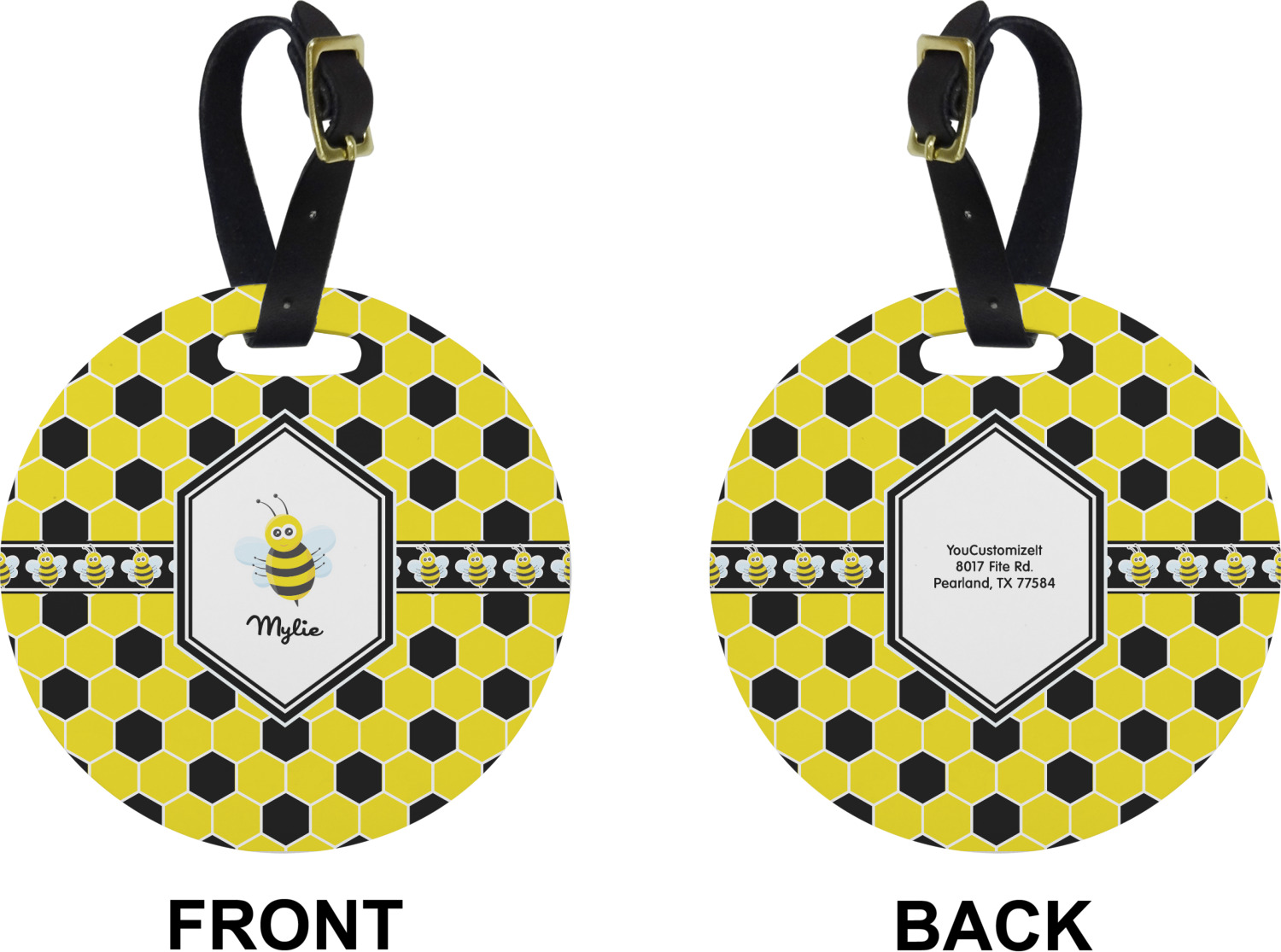 These personalized bag tags are sold in a variety of shapes, so that you may find the product that meets your vision exactly. We sell a round luggage tag, which measures at approximately 4" x 4". Our square luggage tag is about 3.5" x 3.5", while our rectangular version is 2.75" x 4 ".