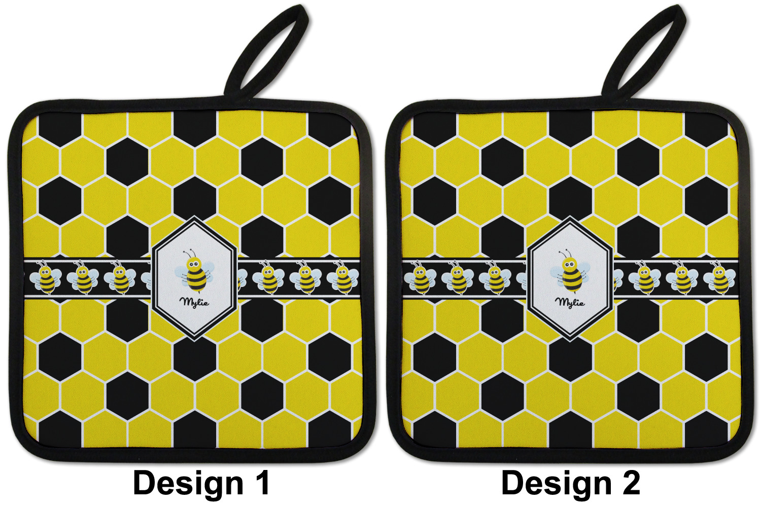 Our personalized pot holders feature a neoprene front that displays your personalization in vibrant colors. The backing of the hot pot holder is rubberized; the textured backing allows you to have a great grip when using this custom pot holder. The two materials are joined with a sleek, black trim, and the holder also includes an attached loop for hanging and storage. The pot holder is approximately 8.75 inches by 8.75 inches and 0.25 inches tall, while the fabric loop is 2.5 inches long. You can purchase a kitchen pot holder by itself or as a set of 2. We also offer a set including one pot holder and one oven mitt.
