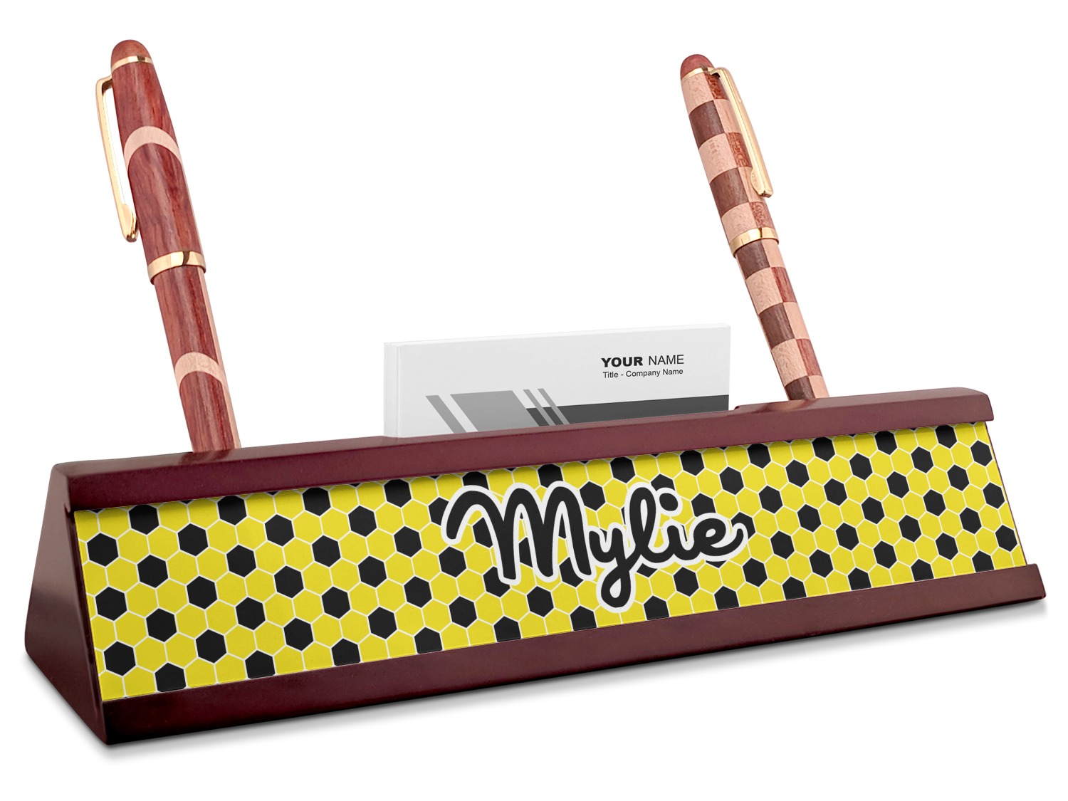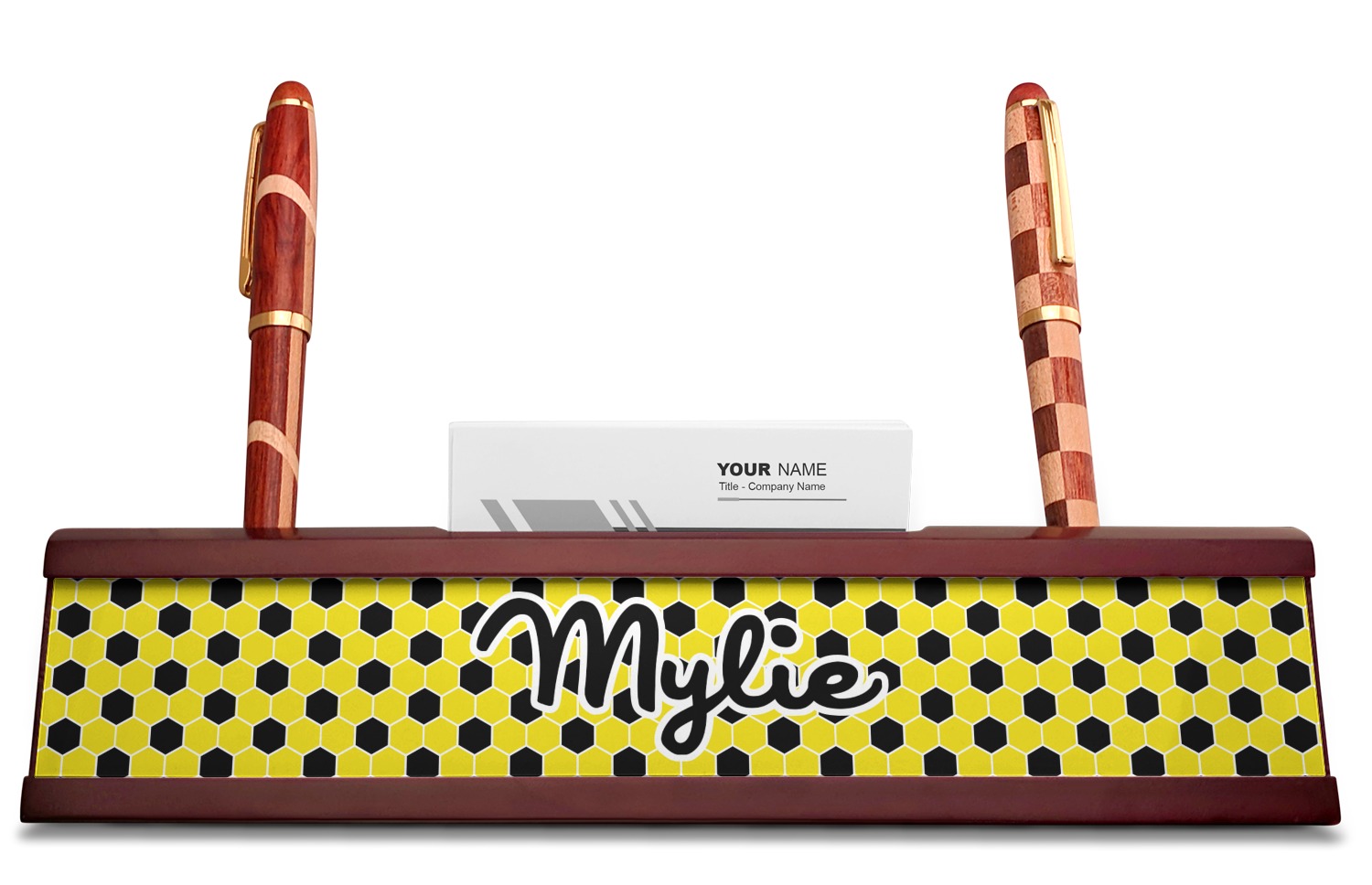 Your desk name plates are crafted from a high-quality, dark-cherry mahogany. At approximately 9.5 by 1.875 by 2.5 inches, this name plaque will fit perfectly, front and center, on your desk. Your customization spans across the entire face of the nameplate. Behind the nameplate lies a skinny slot that can fit approximately 15, traditionally-sized, business cards. You can also store your writing utensils on either side of this custom desk name plate.