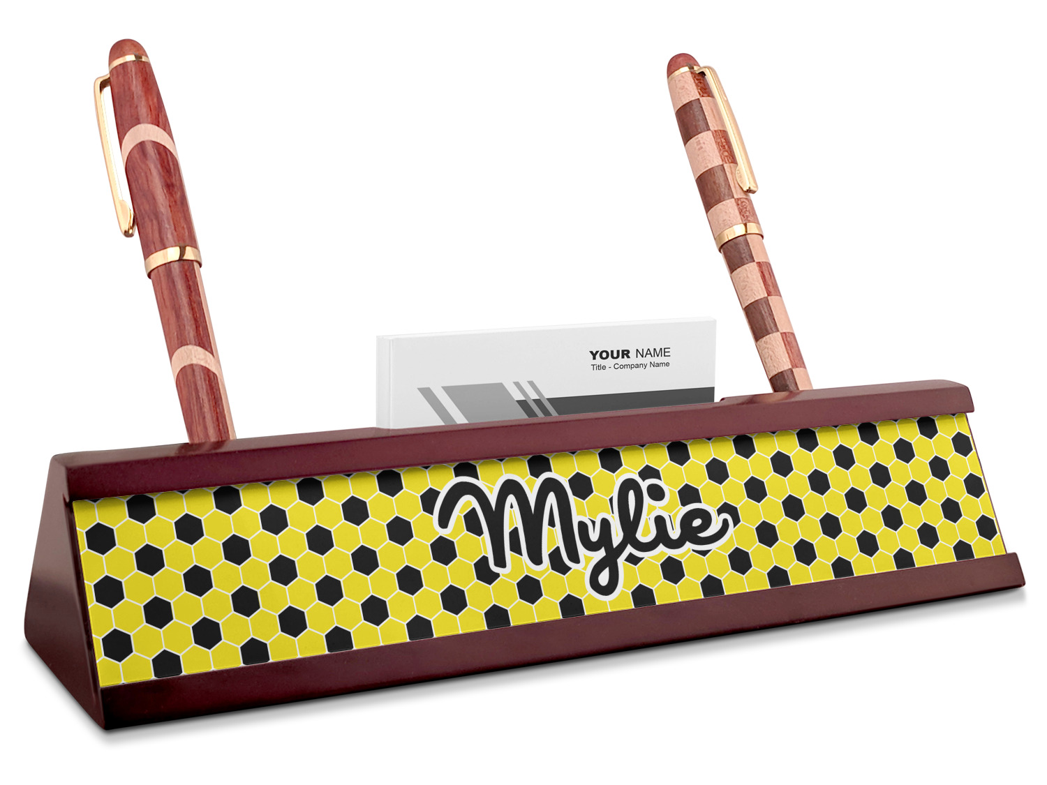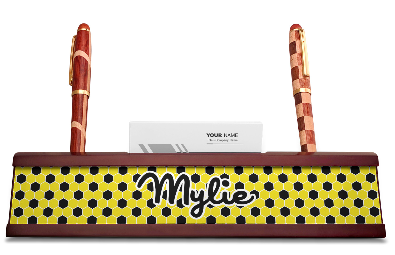 Your desk name plates are crafted from a high-quality, dark-cherry mahogany. At approximately 9.5 by 1.875 by 2.5 inches, this name plaque will fit perfectly, front and center, on your desk. Your customization spans across the entire face of the nameplate. Behind the nameplate lies a skinny slot that can fit approximately 15, traditionally-sized, business cards. You can also store your writing utensils on either side of this custom desk name plate.