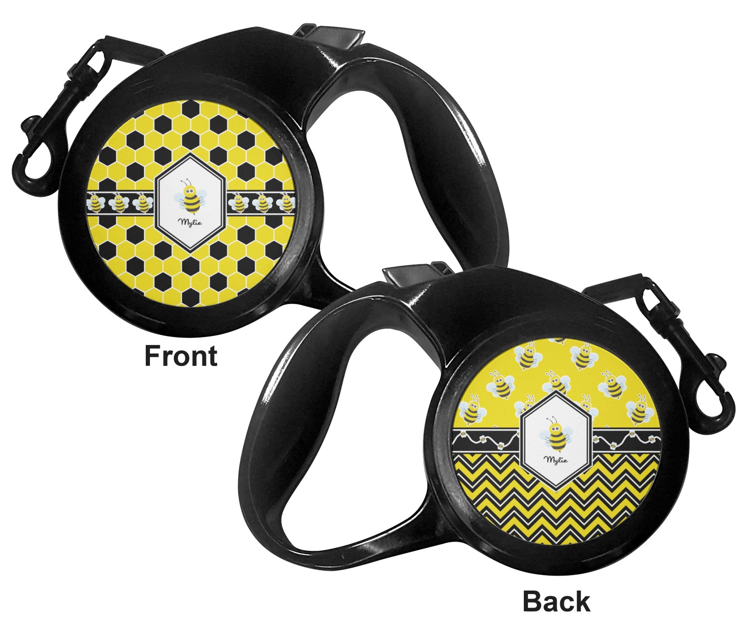 The leash's plastic handle is accommodating of your grip and displays your customization on both sides. The dog leash also features the traditional bolt snap clip, for easy fastening to your dog's collar. The leash and leash handle themselves are both black in color.