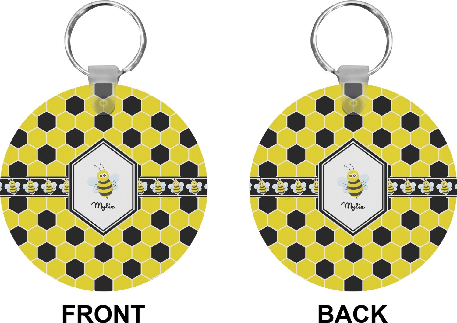 Our personalized keychains attach to the included metal, split key ring with a plastic, removable snap. Since a metal ring is included with your purchase, you have the liberty to keep your keys together on the ring, with or without your unique keychain. We offer this keychain in three different shapes: circle, heart, or diamond. We print your personalized design(s) on both sides of the key chain, and the surface has a glossy, reflective finish that only emphasizes your design. Each keychain is approximately 2.25 by 2.25 inches.