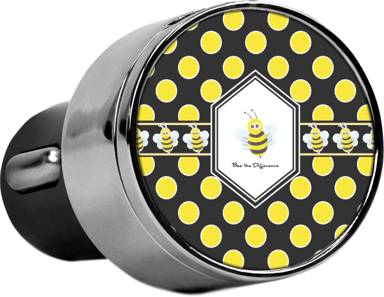 This car charger adapter converts your cars bland cigarette lighter into a decorative, personalized, and operational USB charging port. Made of solid, silver-plated metal, these chargers feature a flip-open lid that both displays your customized design and conceals two USB ports. The metal lid of the USB car charger adapter is 1.5" in diameter and seals due to a small, ingrained magnet on both the charger and its lid. The cigarette lighter insert, itself, is colored black.