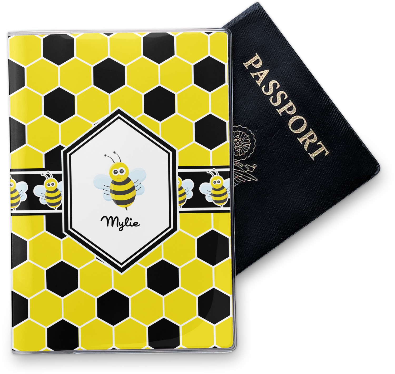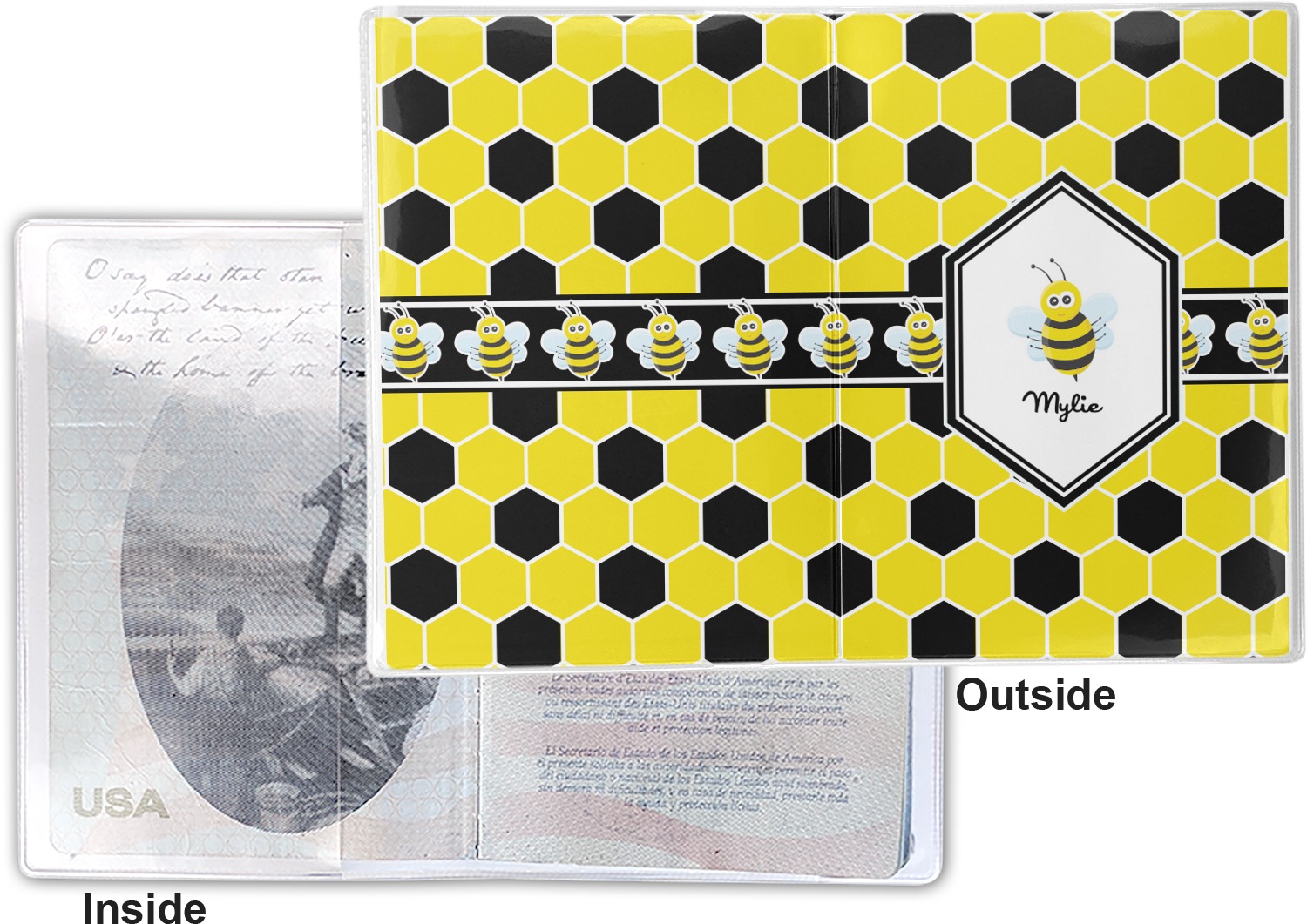 This cover is made of a sturdy clear vinyl with a personalized vinyl insert inside. There is a large and a small pocket on either side to hold the covers of your passport easily and firmly. The passport holder is approximately 7.5" x 5.25", the perfect size to snugly fit your passport. This slim cover is the perfect way to protect your passport without being one more bulky item you have to carry.