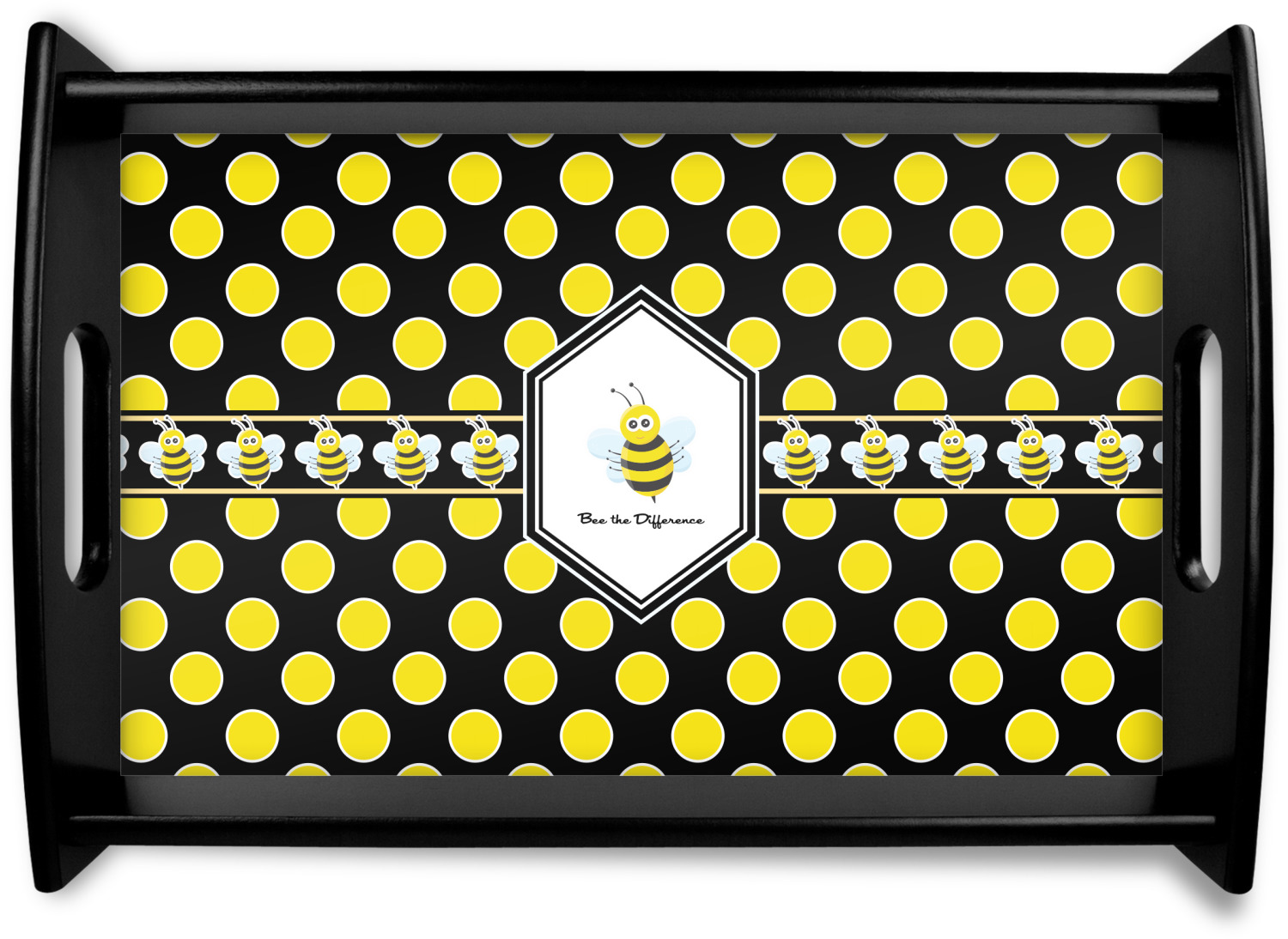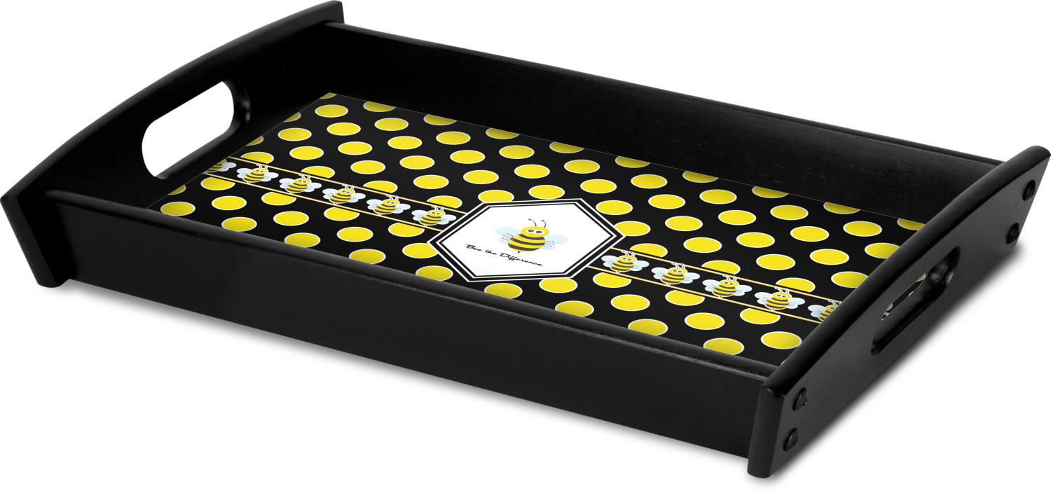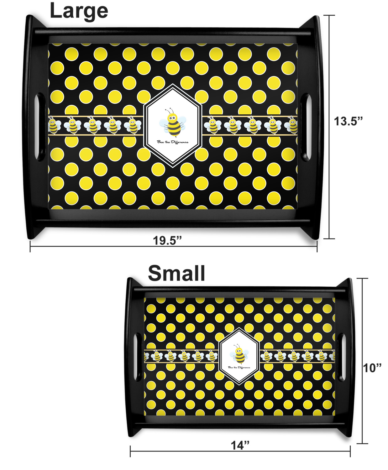 This serving tray with handles features square edges and two rounded sides, creating a very modern look. Each side is fabricated from a beautifully cut, natural wood. The bottom of the interior of the tray displays your customized design in bright, vibrant color. The tray is sold in both a black color and a natural wood look. Each variation of the wood serving tray has two sizes: Small, which is 14" x 10" x 2.25", and Large, which is 19.5" x 13.5" x 2.75".